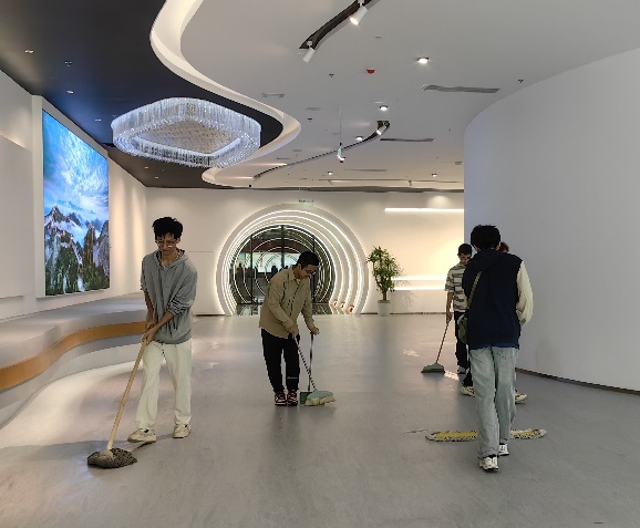 在窦店益生清真肉业有限公司,学生们参观了宽敞明亮的现代化数智车间与展厅走廊,了解到了科技车间的生产模式。作为窦店镇集体经济的支柱企业之一,其产品不仅符合民族特色需求,还有效带动了本地就业和养殖业发展。之后,学生们拿起清洁工具,对厂区环境进行了全面清扫。从展厅到办公区域,同学们认真擦拭设备、清理场地,用实际行动践行劳动精神。企业负责人表示,保持清洁卫生是食品企业的生命线,学生们的劳动不仅美化了环境,更深刻体会到食品安全生产的重要性。