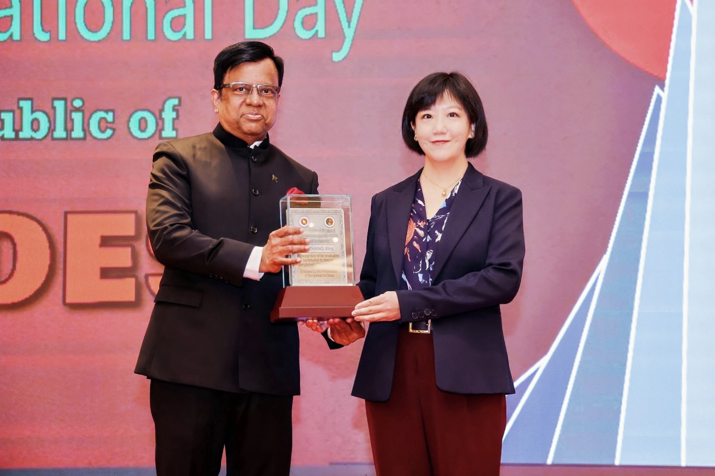 在中国与孟加拉国建交50周年之际,孟加拉国驻华大使纳兹穆尔(Md Nazmul Islam)于2025年4月9日在京举办的孟加拉国独立54周年国庆招待会上,颁授孟中建交50周年贡献奖,表彰为孟中友好关系作出突出成绩的中方五位个人和一个集体。中欧电竞南亚学系南亚文化/孟加拉语教研室主任张幸副教授与四位中国前驻孟大使获得个人奖;中央广播电视总台孟加拉语部获得集体奖。