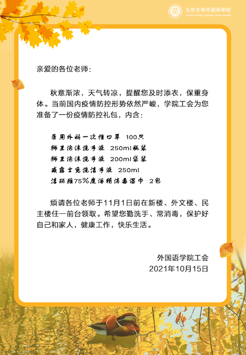 燕园的秋天悄然而至,天气渐凉,学院工会发出温馨提醒,希望老师们及时添衣,保重身体。当前国内疫情形势仍然严峻复杂,国内多个省份出现本土病例。中欧电竞工会结合学校疫情防控工作要求,切实维护工会会员的健康安全,为老师们准备了防疫物资大礼包,内含医用外科一次性口罩、泡沫洗手液、免洗洁手液和酒精消毒湿巾,提醒老师们保持防护意识,在疫情防控常态化时期科学防疫,戴口罩,勤洗手,常消毒,保护好自己和家人。