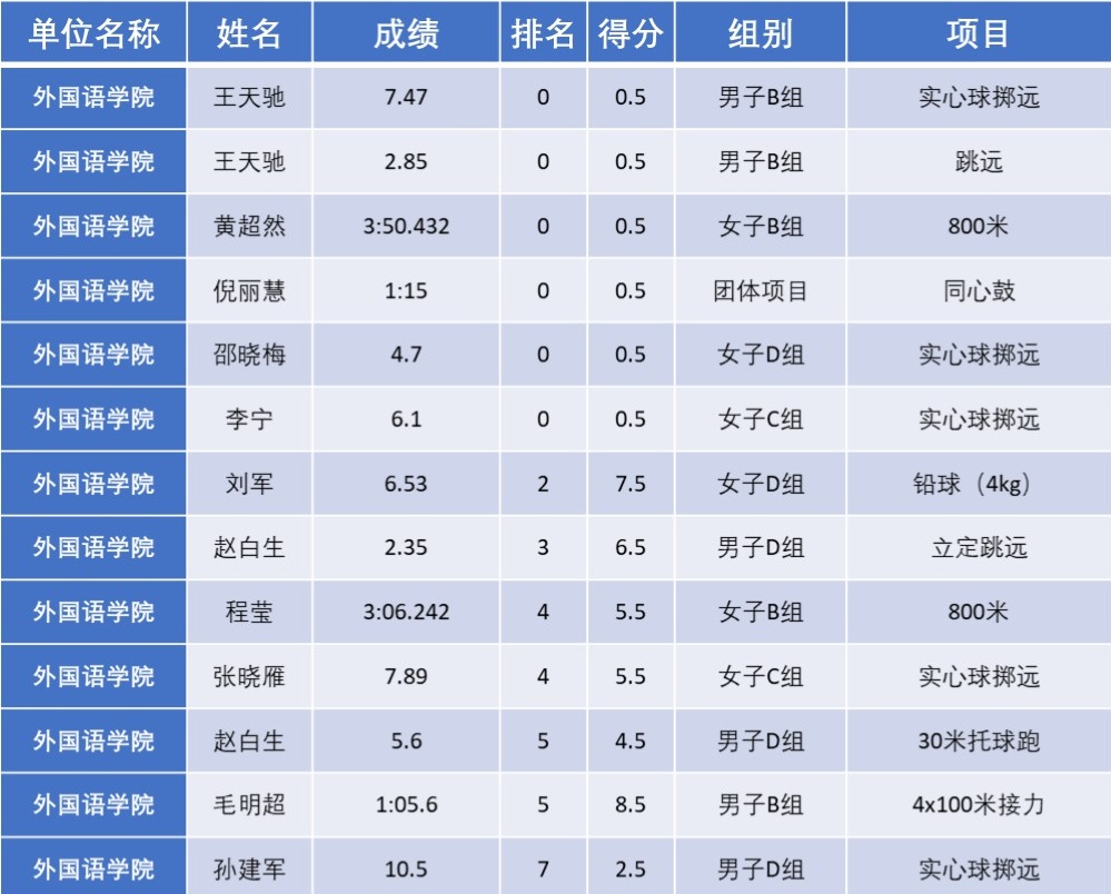 赵白生、王恒、闫梦梦、毛明超、程莹、刘军、王天驰、黄超然等教师们参加了各类竞赛项目的比赛,他们在田径赛场上挥洒汗水,发扬了奋勇拼搏,勇争第一的精神。张晓雁、孙建军、邵晓梅、李宁等参加了实心球等趣味比赛。