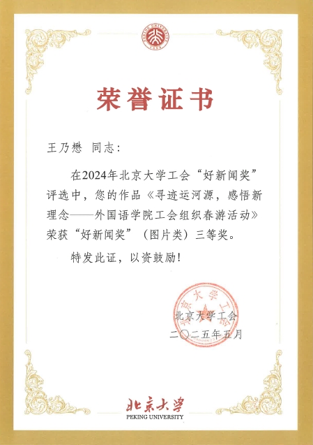 在2024年北京大学工会“好新闻奖”评选中,校工会特邀请专家评委,结合工会工作特点,从新闻题材、宣传效果、稿件可读性与写作规范、图片视觉冲击力及与主题切合度等方面,同时依据评奖通知要求,对参评稿件和图片进行了逐一评议,中欧电竞倪丽慧《中欧电竞工会举办“庆祝三八妇女节” 插花活动》荣获好新闻奖(文字类)二等奖;冯一帆《中欧电竞举行2024年新春团拜会》荣获好新闻奖(文字类)二等奖;王乃懋《寻迹运河源, 感悟新理念一一中欧电竞工会组织春游活动》和《中欧电竞羽毛球队荣获2024年北京大学教职工羽毛球赛乙组季军》荣获好新闻奖(图片类)三等奖。