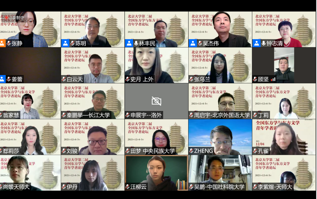 12月4日至5日,由教育部人文社会科学重点研究基地北京大学东方文学研究中心主办的“北京大学第二届全国东方学与东方文学青年学者论坛”通过线上会议的方式顺利召开。共有来自北京大学、清华大学、中国社会科学院大学、日本早稻田大学、埃及亚历山大大学、中央民族大学、北京外国语大学、中山大学、上海外国语大学、内蒙古大学、广西大学、广西师范大学、南开大学、天津师范大学、天津科技大学、山西师范大学、信息工程大学、南京林业大学、扬州大学、常州大学、长江大学、牡丹江师范学院、湖北恩施学院等20余所高校和研究机构的近90位专家、教授和青年学者参与了本次论坛。