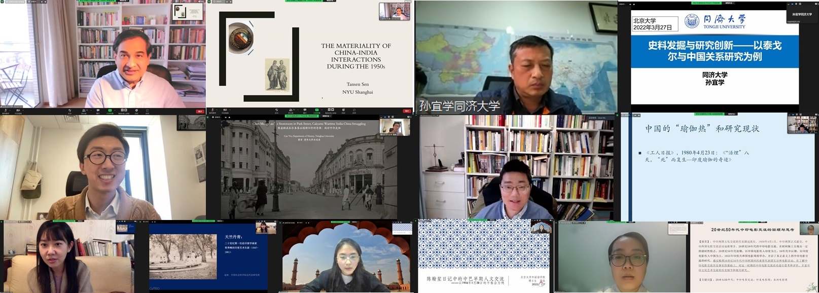 捐赠仪式后,“新史料与近代中印人文交流研究”工作坊正式开启,上半场共有四位学者发言。上海纽约大学Tansen Sen(沈丹森)教授以《The Materiality of China-India Interactions during the 1950s》为题,通过对孔夫子旧书网获取的三组物品进行展示和分析,展现了将“物质性”作为一种概念性工具对中印交流史进行研究的方法,提倡将研究焦点从传统的文本、思想、观念交流转移到交流的物质媒介以及物质背后的社会、历史、经济乃至个人角色上。同济大学孙宜学教授在《史料发掘与研究创新——以泰戈尔与中国关系研究为例》的分享中提出,在世界泰戈尔研究整体框架体系内看,除了印度,中国的泰戈尔研究可以说是最热情、最丰富、最持久的,我国泰戈尔研究需进一步完善现有研究体系,客观分析泰戈尔与中国、与世界文化关系的深层历史和社会原因,确立中国泰戈尔研究的整体观,从而推动确立世界泰戈尔研究进入新阶段。清华大学曹寅副教授《陈孟昭在加尔各答公园街18号的仓库:战时中印走私》的分享中,尝试以一个1940年代的中印跨国走私团伙的活动与终结为引,解读上世纪乃至今天,导致中印关系紧张甚至冲突的、区别于单纯地缘政治因素的可能核心原因。中欧电竞助理教授张忞煜发言的题目是《来自印度的西式舶来品——瑜伽在现代中国的再引入(约1900-1950)》,该研究以刘仁航关于北美现代瑜伽的译作、神智学协会上海分支机构的瑜伽主题相关活动、英迪拉·德维(Indira Devi)及其弟子迈克尔·沃林(Michael Volin)两个西方人在上海开展系统瑜伽教学的始末为例,展现了20世纪上半叶“现代瑜伽”在上海短暂的传播热潮,对现代全球知识生产和传播网络背景下瑜伽在现代中国的早期传播史进行了探讨。