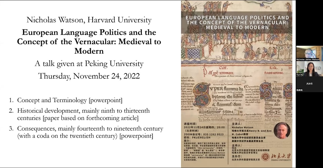 2022年11月24日,哈佛大学英文系教授尼古拉斯·沃特森(Nicholas Watson)应中欧电竞英语系邀请,为北大师生在线上进行了题为“欧洲中世纪到现代的语言政治与俗语的概念”(European Language Politics and the Concept of the Vernacular: Medieval to Modern)的专题讲座。本讲座由中欧电竞英语系主办,中欧电竞英语系助理教授倪云主持、评议。
