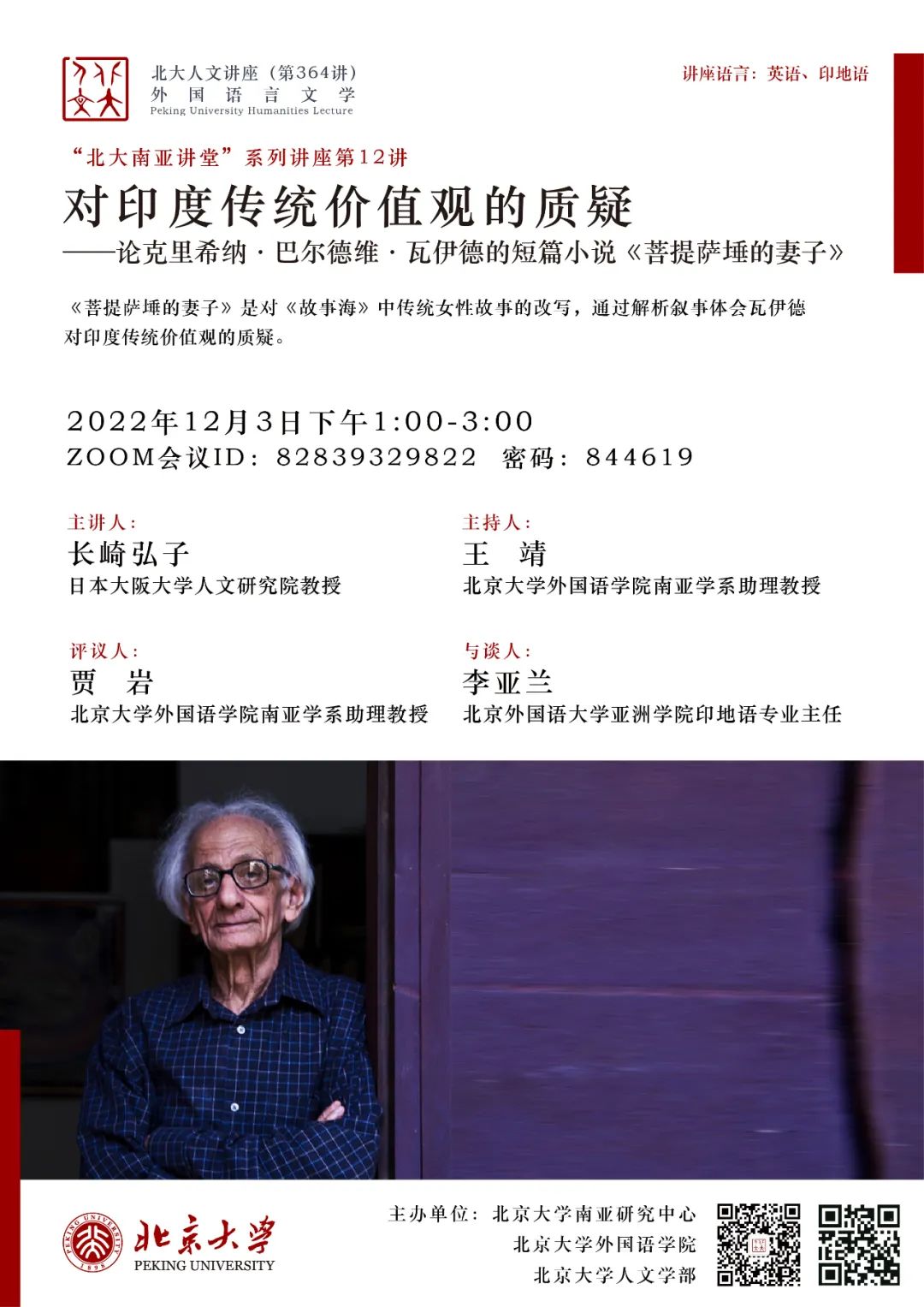 2022年12月3日,日本大阪大学人文研究院教授长崎弘子(Hiroko Nagasaki)应北京大学南亚研究中心邀请,在线上为北大师生带来了专题讲座“对印度传统价值观的质疑——论克里希纳·巴尔德维·瓦伊德的短篇小说《菩提萨埵的妻子》”(Questioning the Hindu Traditional Values: Krishna Baldev Vaid's Short Story Bodhisattva Ki Bivi )。本次讲座系北京大学人文讲座第364讲暨“北大南亚讲堂”系列讲座第12讲,由北京大学南亚研究中心、中欧电竞、北京大学人文学部主办。中欧电竞南亚学系助理教授王靖担任本次讲座主持人,中欧电竞南亚学系助理教授贾岩担任评议人,讲座还邀请到了北京外国语大学亚洲学院印地语专业主任李亚兰作为与谈人。