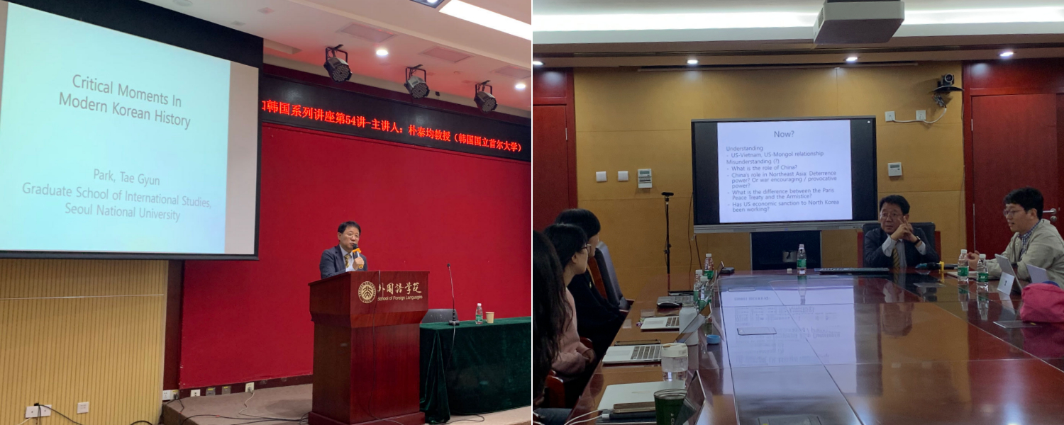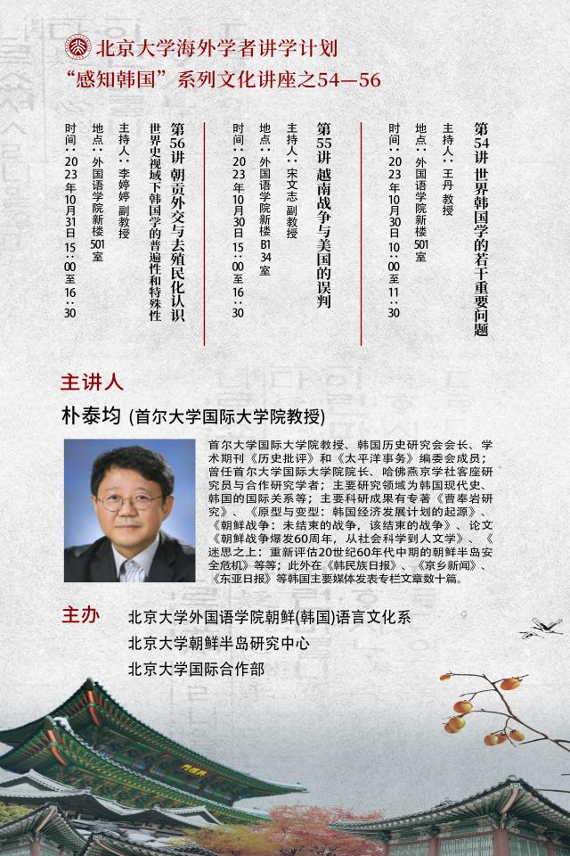 2023年10月30日至31日,受“北京大学海外学者讲学计划”支持,由中欧电竞朝鲜(韩国)语言文化系、北京大学朝鲜半岛研究中心、北京大学国际合作部共同主办的“感知韩国”系列讲座第五十四至五十六讲在外院新楼成功举办。三场讲座主题分别为“世界韩国学的若干重要问题”“越南战争与美国的误判”“朝贡外交与去殖民化认识——世界史视域下韩国学的普遍性和特殊性”,主讲人为韩国首尔大学国际大学院朴泰均教授,由中欧电竞副院长王丹教授、朝(韩)语系宋文志副教授、系主任李婷婷副教授主持,朝(韩)语系全体教师出席,全系各年级同学也积极参与了讲座。
