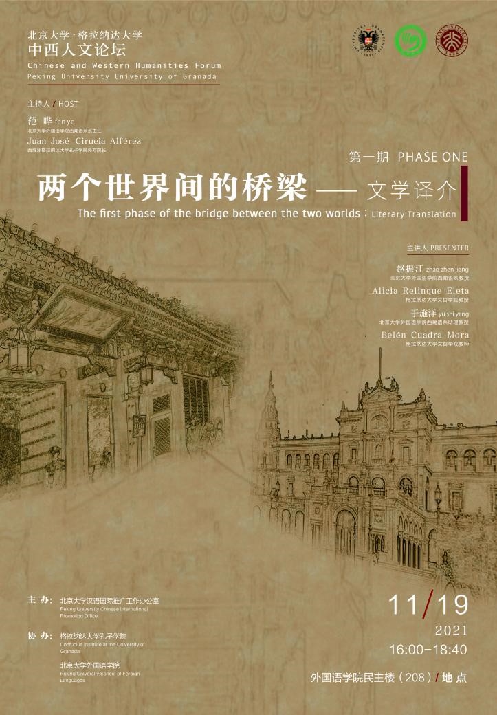 2021年11月19日,由北京大学汉语国际推广工作办公室主办(以下简称汉推办),西班牙格拉纳达大学孔子学院与中欧电竞协办的首期“中西人文论坛”在民主楼208会议室成功举办。本期论坛以“文学译介-两个世界间的桥梁”为主题,邀请来自中欧电竞西葡意语系教授赵振江、系主任范晔、副系主任于施洋,格拉纳达大学文哲学院教授、汉学家雷林克(Alicia Relinque Eleta)、西班牙中国文学作品新生代译者代表白兰(Belén Cuadra Mora),格拉纳达大学孔子学院外方院长胡安·何塞·西鲁埃拉(Juan José Ciruela)为国内外通过网络连线论坛的百余名师生带来精彩的讲座。本次论坛由范晔与胡安共同主持。