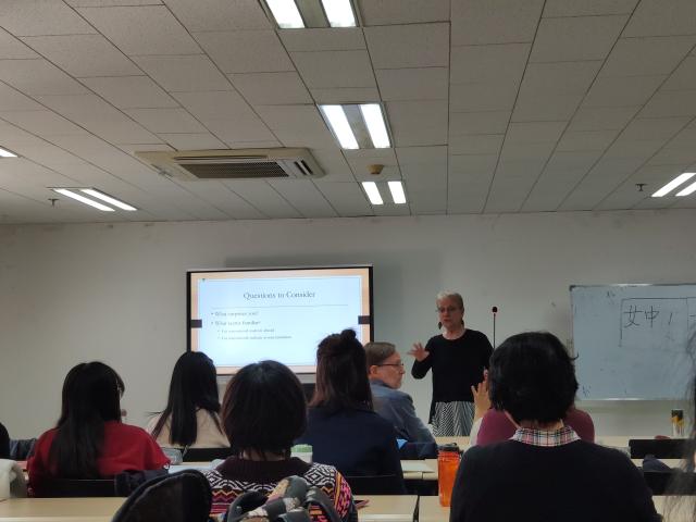 2019年11月7日、8日,华盛顿大学英语系教授Sandra Silberstein应中欧电竞外国语言学及应用语言学研究所邀请,在北京大学举办了“全球化的大学:来自教师、助教和多语言背景学生的报告”(The Globalizing University: What the Faculty, TAs, and Multilingual Students Report)和 “二语阅读”(Reading in a Second Language)两场学术讲座。来自中欧电竞、北京外国语大学、北京林业大学的许多师生到场聆听,讲座由语言所助理教授郑萱主持。