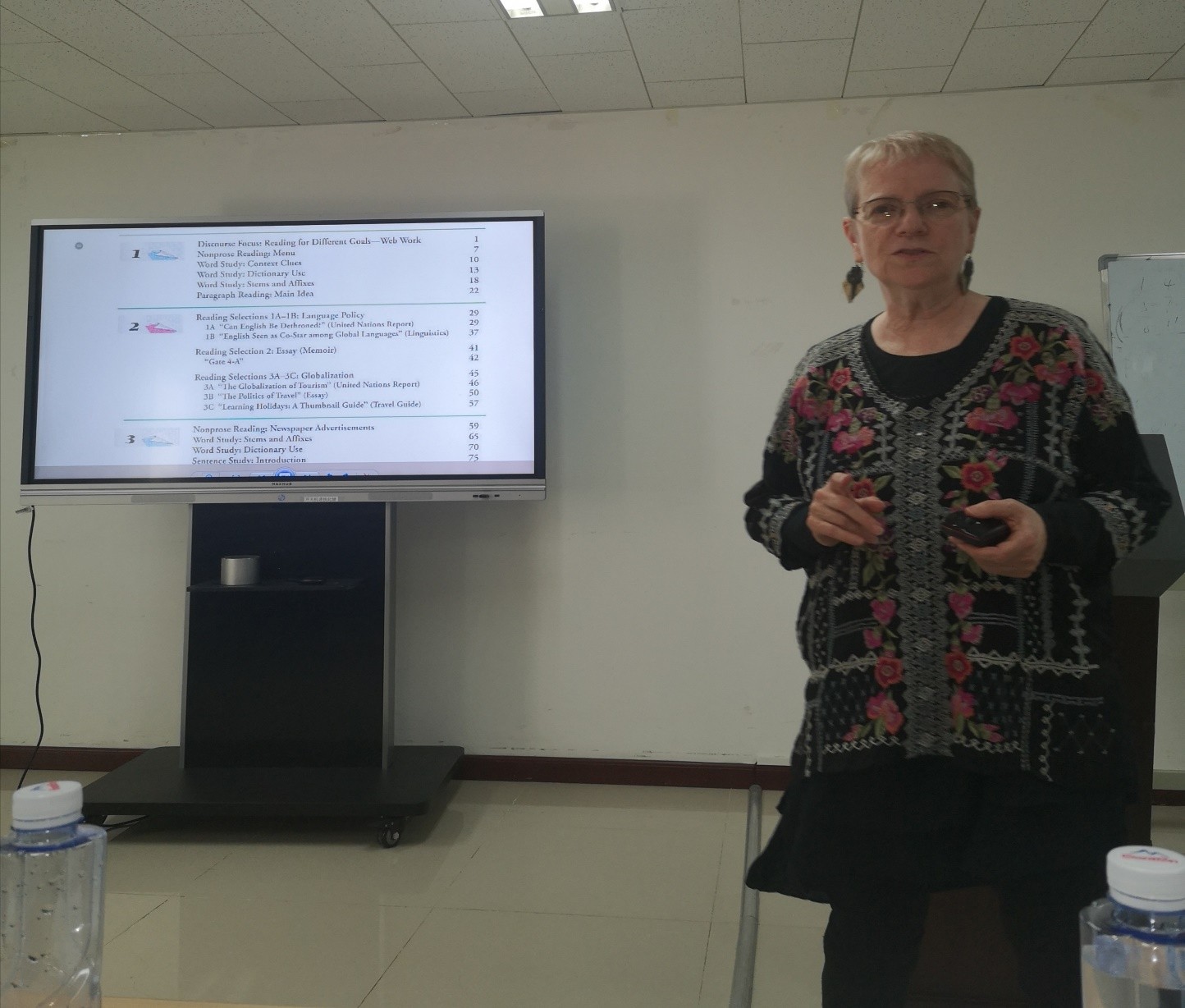 8日下午,Silberstein教授在中欧电竞新楼301给大学英语教研室的教师及语言所的师生进行了二语阅读教学的展示性讲座。整场报告围绕着以下几个问题展开:什么是阅读?阅读课的目标是什么?阅读课中教师承担着怎样的角色?如何进行批判性阅读的教学?如何对阅读材料进行评估?Silberstein教授在报告中不仅有理论性的介绍,也有直观简明的教学示范。她以一首不同寻常的小诗作为讲座的开场,让在场师生一起进行阅读和讨论。面对师生们对于同一问题给出的不同答案,Silberstein教授解释到人们在阅读时都会带着自己独特的社会经历和文化背景进行阅读,作为阅读教师需要认识到这一点并充分挖掘出学生的潜力,让他们做到读有所思,读有所得。接下来,Silberstein教授还展示了阅读中词汇学习的方法、如何针对不同材料调整阅读策略、如何用简单的问题启发学生进行批判性阅读等。
