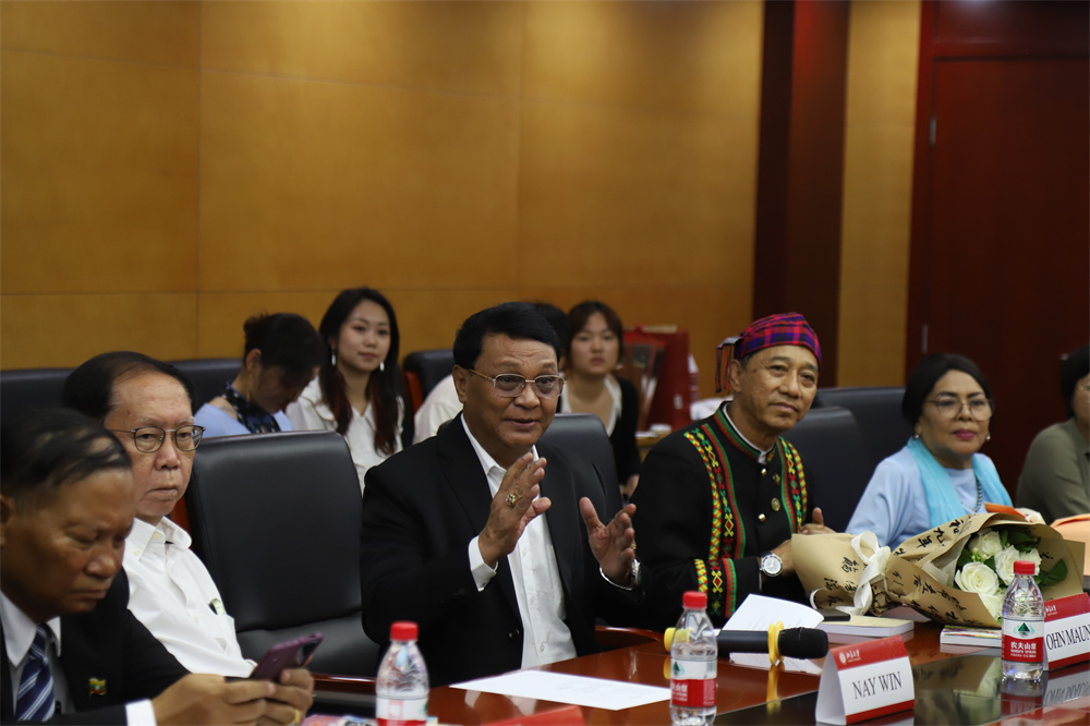缅甸作家协会主席、缅甸国家文学终身成就奖获得者、功勋文学家吴翁貌先生致辞。他表示,非常荣幸到访历史悠久、蜚声中外的中国最高学府北京大学。缅语专业师生们的热情和歌声,让缅甸代表们倍感温暖与亲切,希望此次交流激发青年人对缅甸文学的兴趣,鼓舞文坛作品互译交流,以实现文明互鉴。
