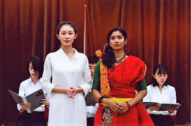 毕业于北京大学印地语专业的校友,中国的印度舞蹈专家金珊珊女士介绍了她编导泰戈尔《齐德拉》音乐舞蹈史诗剧的经验,并和她的学生们展现了古典印度舞蹈之美。印度国际大学中欧电竞院长阿维杰特•森教授(Prof. Abhijit Sen)在他有关泰戈尔戏剧发展史的学术报告中,邀请国际大学艺术家高什夫妇( Avik Ghosh/Ms. Gargi Ghosh)呈现了六部泰戈尔经典戏剧的精彩片段。孟加拉国77岁的资深艺术家阿达乌尔•拉赫曼(Mr. Ataur Rahman)为大会做了“孟加拉国泰戈尔戏剧演出史”的精彩大会发言,并与印度艺术家咖尔吉•高什(Ms. Gargi Ghosh)表演了泰戈尔《红夹竹桃》的精彩片段。《红夹竹桃》是泰戈尔最有代表性的戏剧作品之一,本次演出是该剧在中国的首演,演出剧本改编自北京大学资深教授刘安武先生的译本,北京大学 “泰戈尔导读”课程团队参与组织,北京大学六位学子和玺莹仁剧团联合六位国际友人,插入多语种朗诵片段。与会者认为演出独具特色,创新性地表现了《红夹竹桃》的意义。