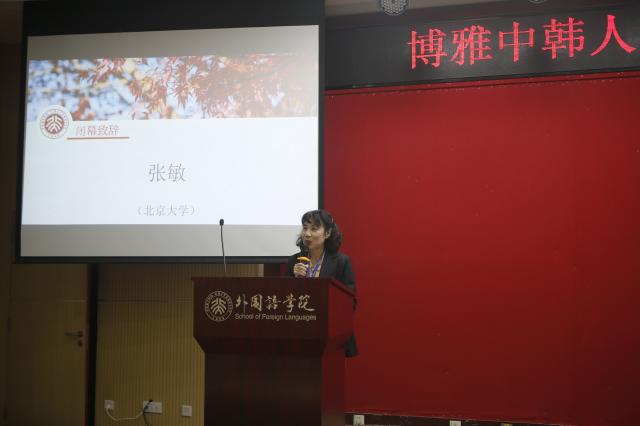 在闭幕式中,首先由各分会场负责人进行总结发言,北京大学的王元周教授、山东大学的牛林杰教授和上海外国语大学的赵新建教授分别对历史与文化组、文学组和语言与韩国语教育组的讨论情况进行了总结和评论。最后,朝鲜(韩国)语言文化系张敏教授在闭幕词中充分肯定了本次论坛对国内韩国学跨学科研究的推动作用,并对博雅中韩人文学论坛的再次举办表示期待。