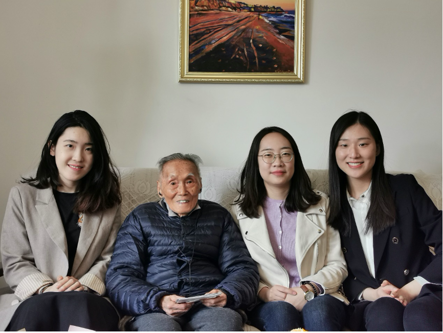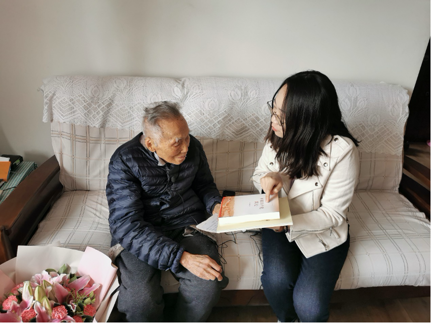 探访当天早上,殷洪元老师刚到医院做完例行治疗回到家,身体稍感疲惫,但同学们仍然受到了热情接待。在专题访谈中,当同学们问起老师为什么在如此高龄还要申请入党、与党之间有哪些特殊的故事时,殷老师从三方面深情地讲述了自己的入党初心。首先,殷老师的姐姐曾经是一位上海中共地下党员,她对殷老师产生了很大的影响。其次,在求学期间,殷老师就读于国立东方语言专科学校,由于学校和南京中央大学距离很近,殷老师受到了许多当时南京中央大学的进步青年的影响,学习了很多先进的新思想。最后,2020年,他看到在抗击新冠疫情和脱贫攻坚中党发挥的重要作用,再次意识到了党的先进性和纯洁性,因此决定郑重地向党组织提出入党申请。