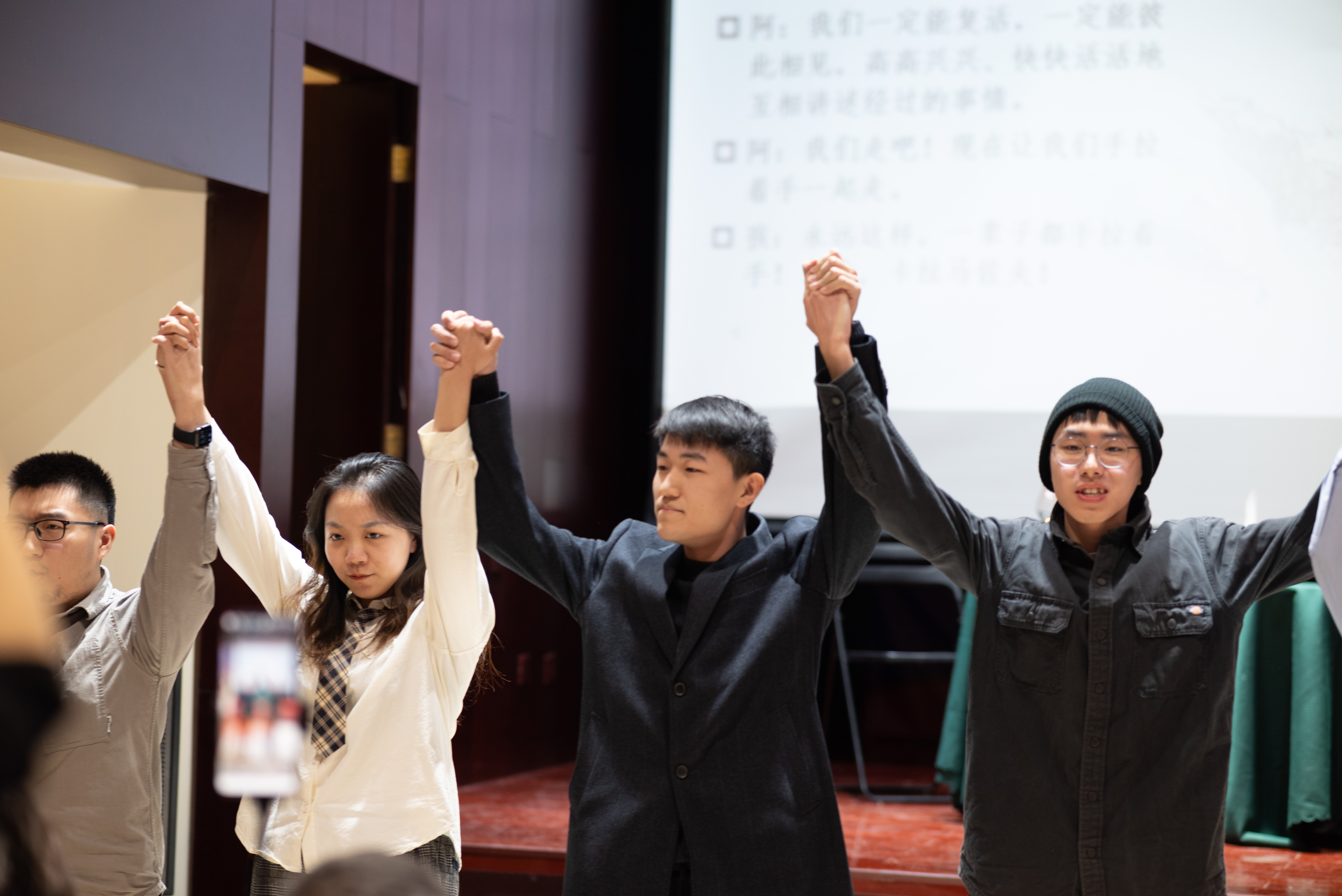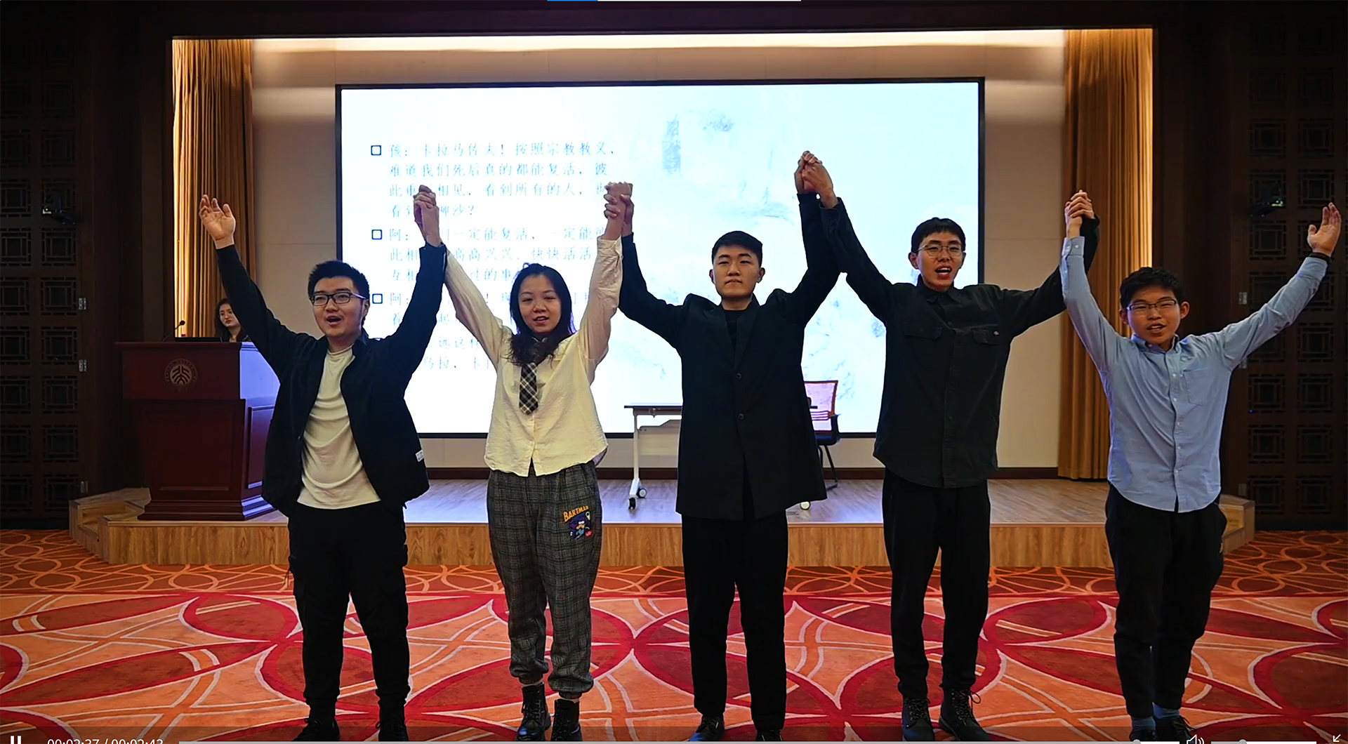 由中欧电竞俄罗斯语言文学系同学排演的三幕话剧«Раскольник и др.»(《拉斯柯尔尼科夫一众》)是本次活动的第五个节目。整部剧时长约十六分钟,《地下室手记》《罪与罚》《群魔》《荒唐人的梦》《卡拉马佐夫兄弟》中的主人公们轮番登场,他们在惶恐焦虑、急切不安的状态下爆发,以难以遏制的激情直抒胸臆。通过他们的表演,观众可以理解陀氏人物的内心世界,体会他们在思想上的传承、在观念上的碰撞。每幕仅五六分钟的话剧,布景道具要而不繁,汇聚传统手法和现代风尚,有力呈现了陀氏作品的精神内涵。