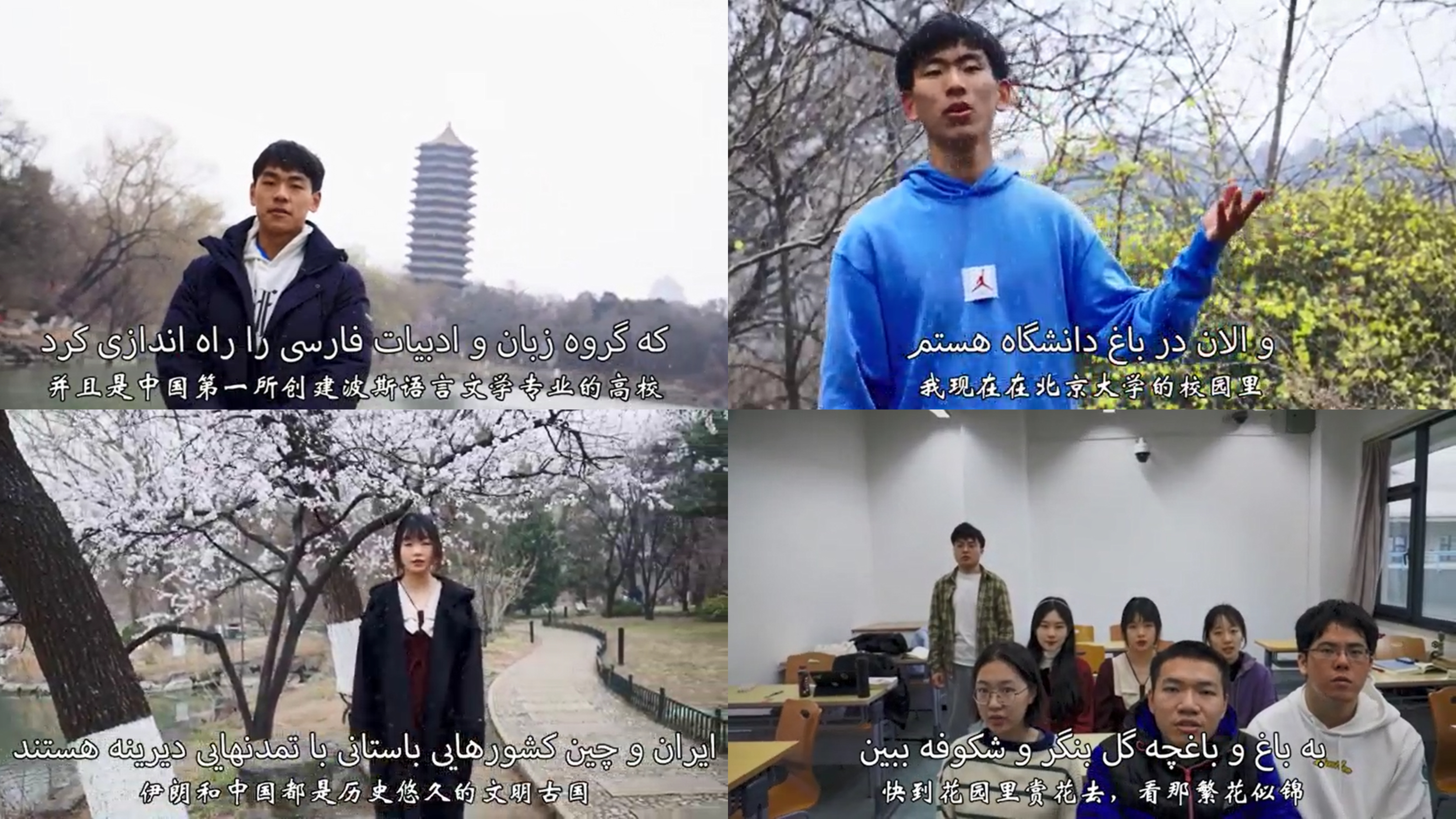 同学们全程参与了视频的前期策划、脚本撰写和拍摄剪辑。在视频中,同学们回溯了中国与伊朗之间的历史渊源与文化交流,介绍了北京大学的历史概况与文化内涵,讲述了北京大学波斯语专业对中国伊朗学的开创性作用,并朗诵了由伊朗外教贾拉利(Mohammadamir Jalali)博士创作的“春之诗”。