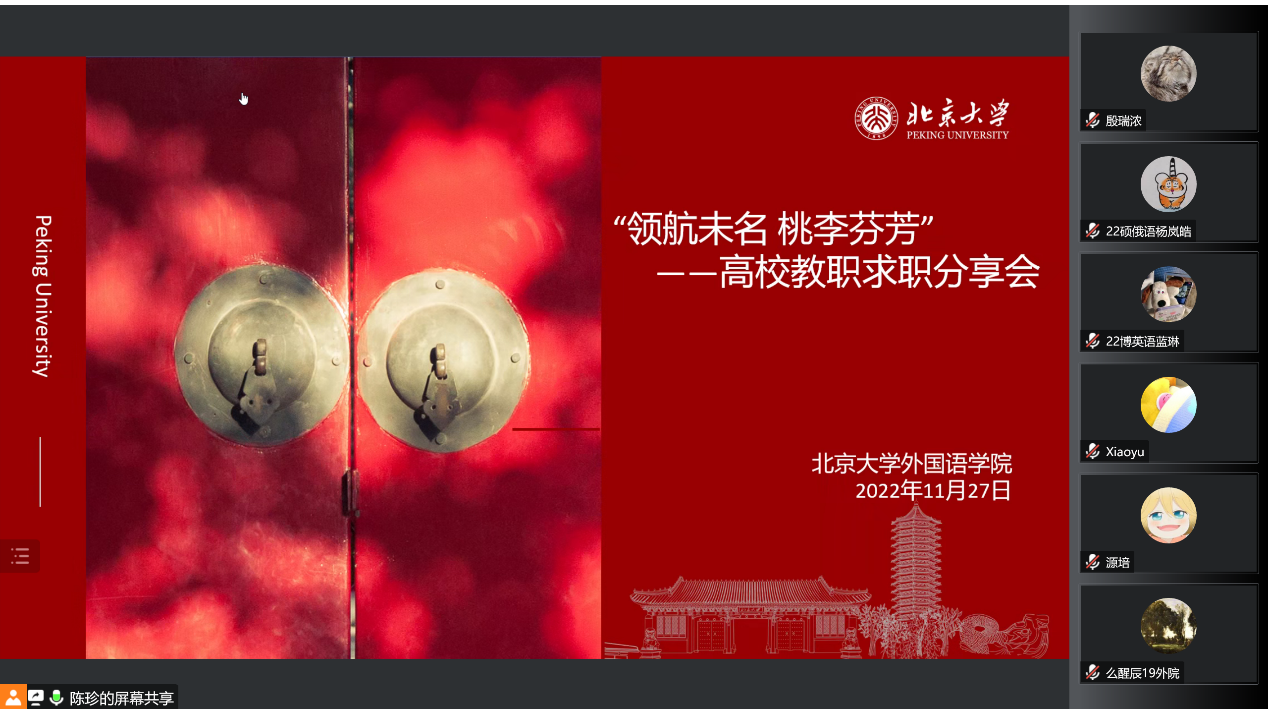习近平总书记曾明确指出:“教师是教育工作的中坚力量。有高质量的教师,才会有高质量的教育。”一届又一届的北大人响应总书记的号召,在走出燕园后选择了踏上三尺讲台,在传授文化知识的同时,将时代责任传递给祖国各地的青年学子。为了帮助有志于教育事业的同学们进一步明确努力方向,2022年11月27日下午,中欧电竞以线上形式举办了“领航未名 桃李芬芳”中欧电竞高校教职求职分享会。中欧电竞党委副书记王恒、团委书记伍昕钰、辅导员丁尧,以及学院五十余名学生参加了本次分享活动。