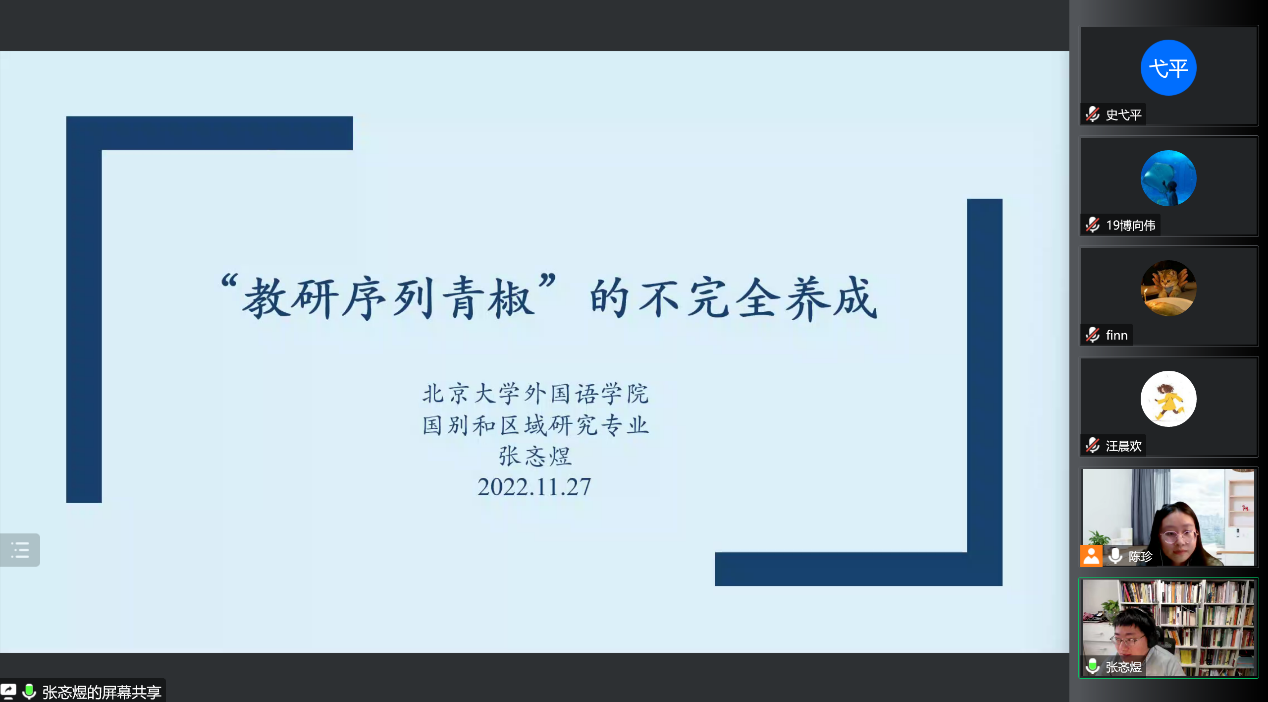 分享会共邀请到两位北大校友担任主讲人,分别是先后任职于北京外国语大学亚非学院地区研究教研室和中欧电竞国别和区域研究专业的中欧电竞2016届印度语言文学专业博士研究生张忞煜老师,和现任职于对外经济贸易大学英语学院的中欧电竞2022届英语语言文学专业博士研究生马骧老师。此次分享会主要分为经验分享和互动答疑两个环节。