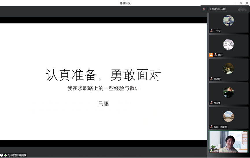 马骧老师结合自身的面试经历,从求职流程、心态准备、考试要领、面对入职后压力的方法等四个方面进行了分享。她指出,在求职过程中,保持稳定而积极的心态非常重要。同学们在心态方面可以做的准备包括:尽早完成毕业论文的撰写工作,避免同时面对来自论文与求职两方面的压力;勇敢投递简历,不要被畏难情绪所击垮;提前预演面试流程,做到心中有数;与同伴信息共享,相互支持。马骧老师鼓励大家:“北大外院的毕业生可以对自己多一点自信,尝试更多的机会。”
