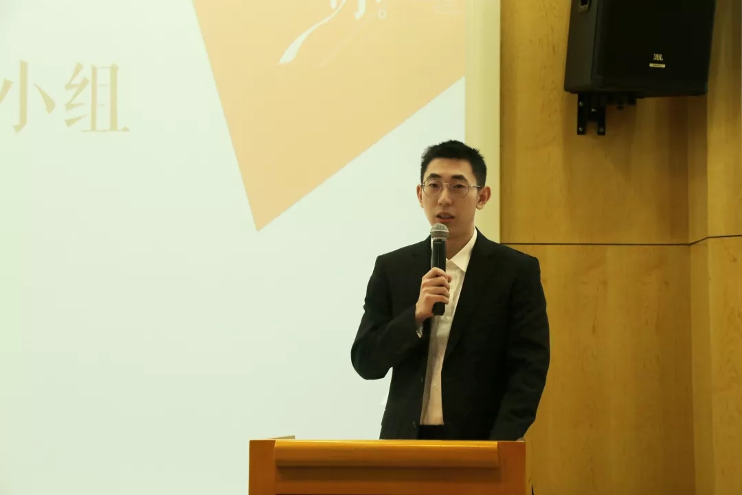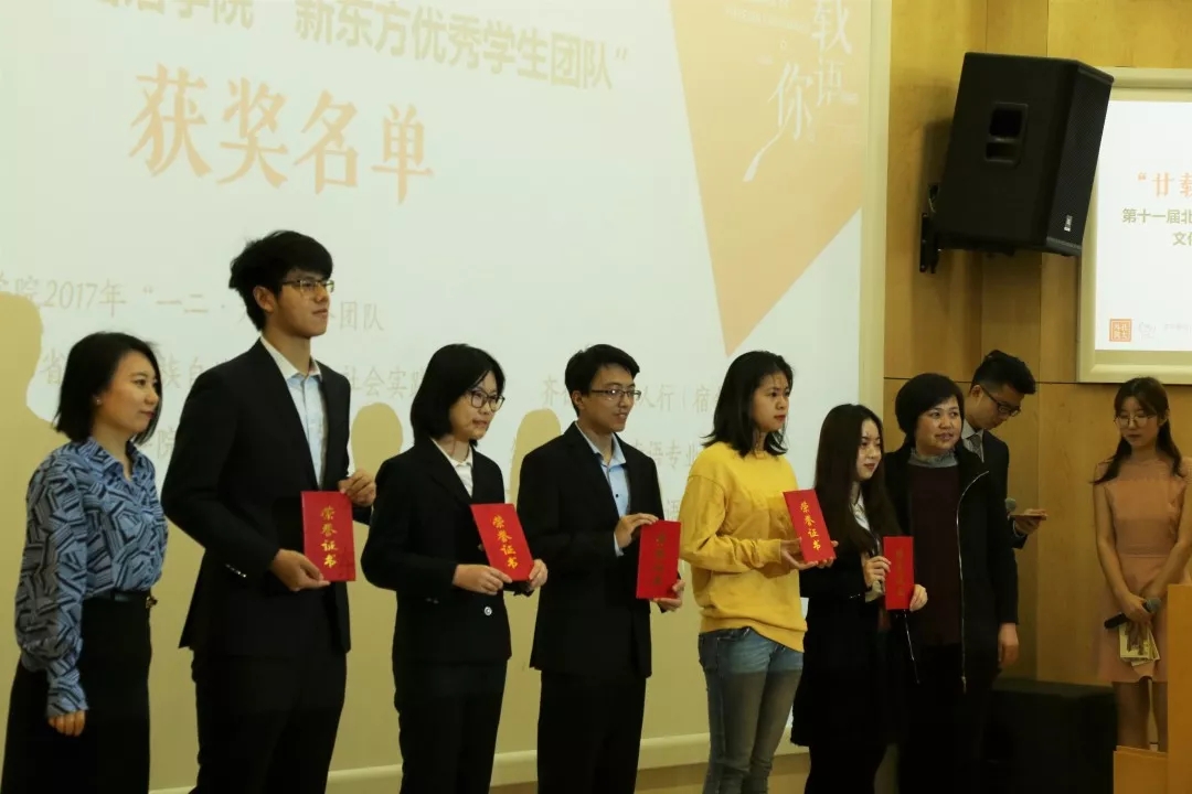 接下来进行的“新东方优秀学生团队”颁奖仪式中,10支获奖团队代表上台领奖,李淑静、高静、付志明、宋扬上台为获奖代表颁奖。之后,“新东方优秀学生团队”获奖团队代表、中欧电竞2018级亚非语言文学硕士研究生许洋分享东南亚华文教育调研小组团队实践收获。