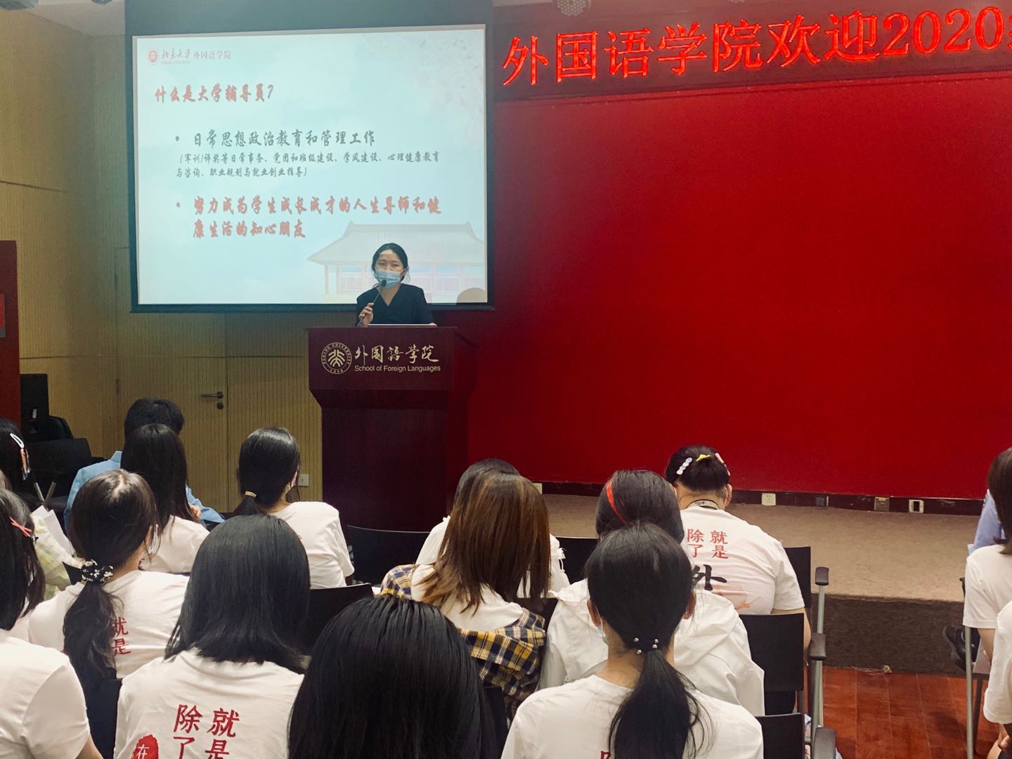 在新生辅导员见面环节,于丹为学生介绍辅导员工作范围,希望成为学生成长成才的人生导师和健康生活的知心朋友,并就大学生活应该做些什么展开讨论。
