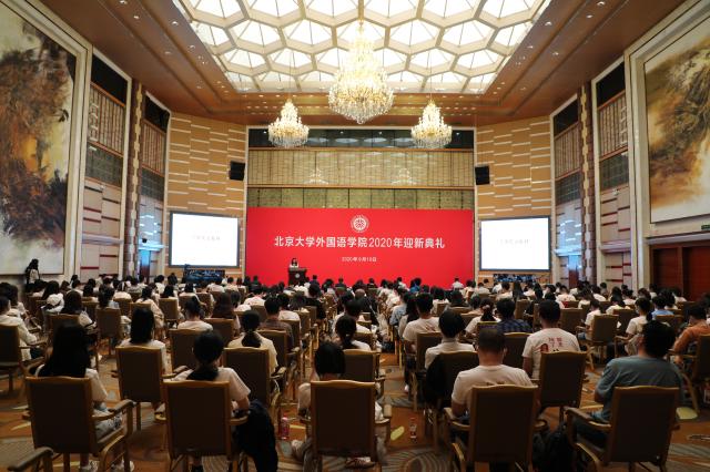 在热烈的掌声中,院长宁琦为2020级新生送上开学寄语。宁老师首先代表学院全体师生员工祝贺并欢迎新同学成为北大外院的一份子。随后,她结合当下新冠疫情的影响与国际格局变动,指出日常生活中被人们一直忽略的不确定性才是个体生命的常态。在急剧变化着的、充满不确定性的世界中,人们更需要找到自己安身立命的位置。