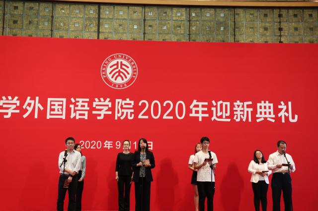 在校生代表热烈欢迎新外院人的到来。英语系2019级博士生陶叶茂讲述了抗“疫”期间,外院学子投身多语种翻译,贡献青年力量的故事。她认为,翻译活动是外院人在疫情期间的一个重要战场,同时,外院青年服务国家的方式还有无数种可能。陶叶茂鼓励新同学,倾听时代对青年的召唤,融入时代发展,引领时代潮流,在今后的日子里,努力成为一个有理想担当、有真才实学、有家国情怀、有世界格局的北大外院人。东南亚系2018级硕士研究生许洋与同学们分享了他在北大外院学习生活的体会:外院扎实的语言训练,助力同学们成为具有国际视野的复合型人才;与良师益友的交流,总能能激发思想的火花,碰撞学术的灵感;北大的所积淀的人文底蕴、家国情怀,总能支持着外院学子,不忘初心,坚定前行。他相信新同学们必定能在外院收获更多精彩。