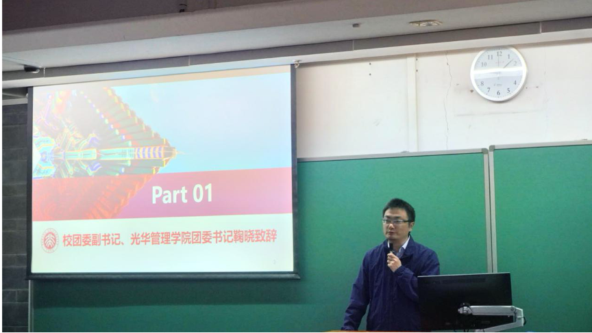 鞠晓代表校团委对中欧电竞2020年思政实践课程的圆满完成表示祝贺,并预祝外院新学年思政实践课程的开展一切顺利。他介绍了今年北大思政实践课程的开展情况,对外院思政实践工作表示支持与肯定,并分享了他在今年思政实践中观察到的外院学子的优秀特质:一是很强的行动力;二是广阔的视野;三是心向祖国的信念。他希望在座的同学们充分汲取师兄师姐们的经验,积极学习相关理论知识,在接下来的课程学习中,收获知识,收获友谊,收获成长。