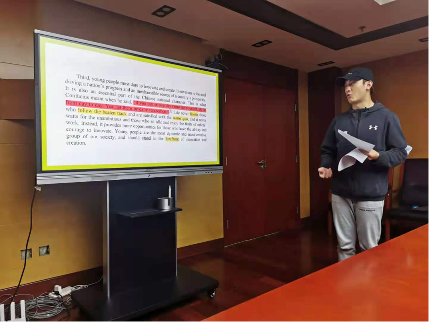 德语班领读人李牧翰选取了篇目《创新正当其时,圆梦适得其势》。他首先对上次读书会所学内容进行了复习,听写了时政热词。随后,李牧翰带领学生们认真讨论了“如何向外国朋友讲好‘中国故事’”。他为学生们讲解了在促成社会主义现代化建设过程中中国共产党所付出的不懈努力。他鼓励同学们将中国传统文化应用于中国故事的讲述,韦编三绝、头悬梁锥刺股、凿壁偷光等故事中都蕴含着中华民族的宝贵精神品质。