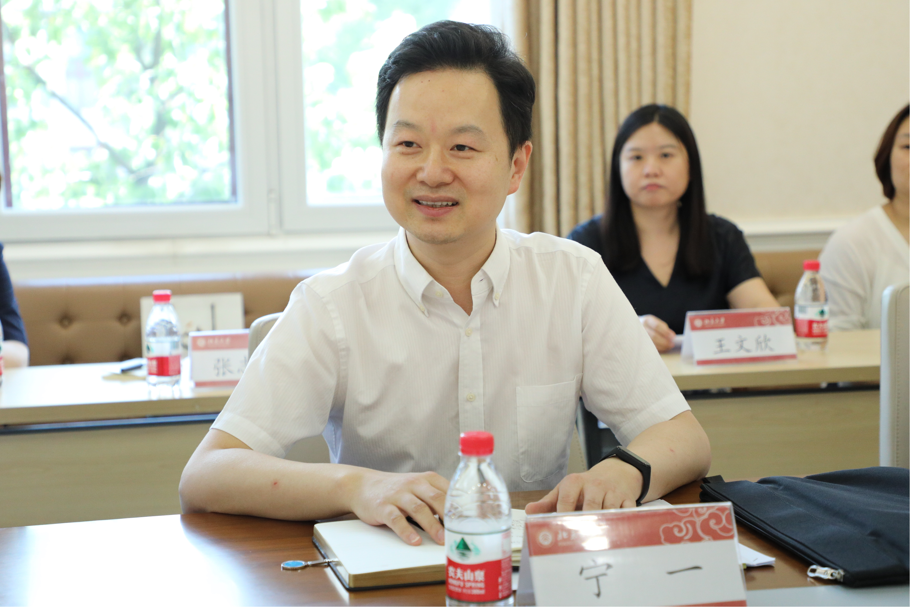 宁一副馆长回顾总结了华侨历史博物馆与中欧电竞前期的合作成果。宁一表示,自去年以来,馆院双方已在党建活动、志愿服务、展览策划、藏品研究等方面进行了一系列探索和尝试。2022年10月中欧电竞党政领导班子率学院教师赴中国华侨历史博物馆调研。今年5月,中欧电竞的志愿者同学们协助馆方开展“华踪医迹——东南亚华侨华人与中医药文化展”英语直播讲解。直播内容在各大平台播出,累计在线观看量达到938400人次。最后,宁一介绍了双方合作的设想,提出可以从思想政治教育和学科建设两方面推进合作,开展协同育人工作。