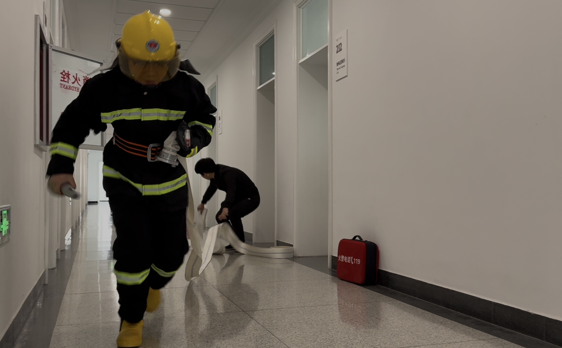上午9时51分演练开始,此次演练以外文楼206会议室突发火情为背景,远程值班的中控室值守人员通过主机显示屏确定报警位置后,迅速通知到外文楼值班员,外文楼值班员迅速携带应急包到现场确认火情,当发现火情无法控制时,通知值守人员请求支援。值守人员接到报讯后迅速启动应急预案,打开楼内应急广播通知疏散,微型消防站人员即刻启动消防栓灭火。每一层的疏散负责人立刻到位,冷静有序地组织楼内人员进行疏散,引导师生按照预定疏散路线,用湿毛巾捂住口鼻迅速撤离至集合地点。消防志愿队配合完成火源初期扑救,整个过程在3分钟内有序完成,充分检验了应急预案的实操性。