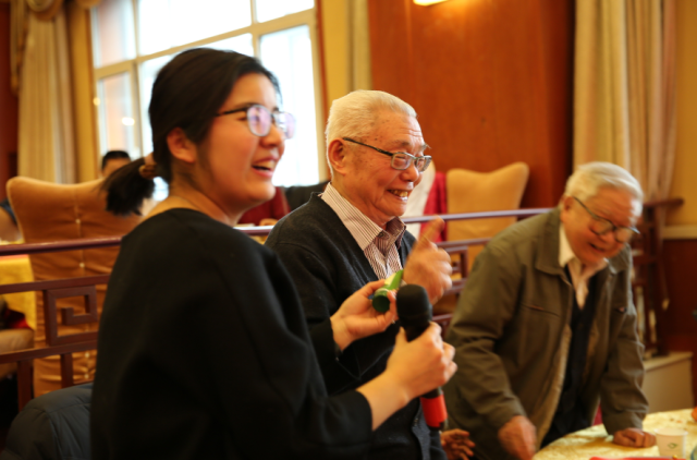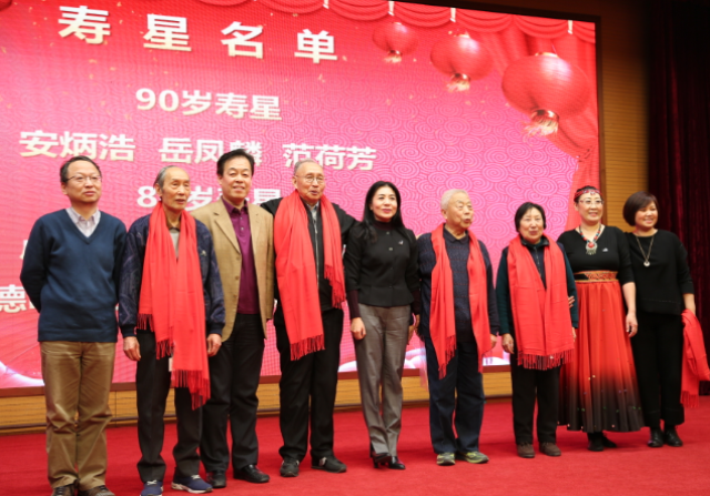 向年满80岁和90岁的老教师祝寿是外院历年联欢会的经典节目,今年外院共有7位80岁寿星和3位90岁寿星,老寿星们伴着《祝你生日快乐》的歌声缓缓的走上舞台,院务会全体成员一起为老寿星们送上代表喜庆和祝福的红围巾,并祝愿他们身体健康,心情愉快,福如东海,寿比南山!