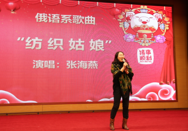联欢会的节目种类丰富、异彩纷呈。俄语系张海燕老师为联欢会献上了俄语歌曲《纺织姑娘》,优美婉转的歌声充满了浓浓的异域风情。伴随着大屏幕上展示的燕园美丽景致,大学英语教研室的老师们为大家带来了歌曲联唱《“爱”之歌》。