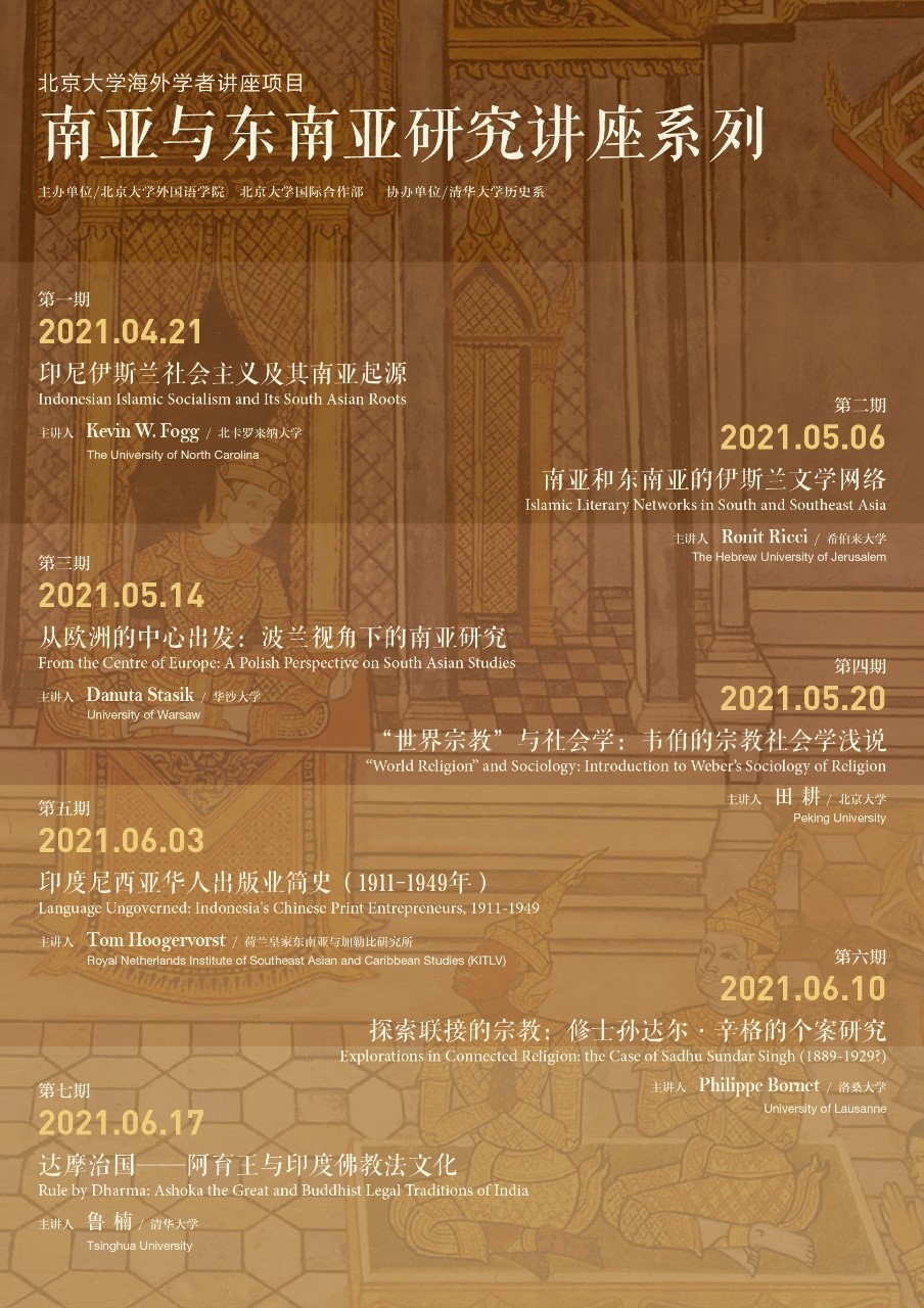 2021年4—6月“南亚与东南亚研究讲座系列”顺利举办。本系列讲座由中欧电竞和北京大学国际合作部主办,清华大学历史系协办,并得到了北京大学人文社会科学研究院的支持。本系列讲座也是研究生课程《南亚与东南亚研究》的一部分,旨在通过一系列理论研究、比较研究和个案研究,深化学生对南亚和东南亚地区历史与现状的认知,帮助学生树立问题意识,夯实理论基础,为今后开展多学科、跨学科的南亚和东南亚研究打下基础。