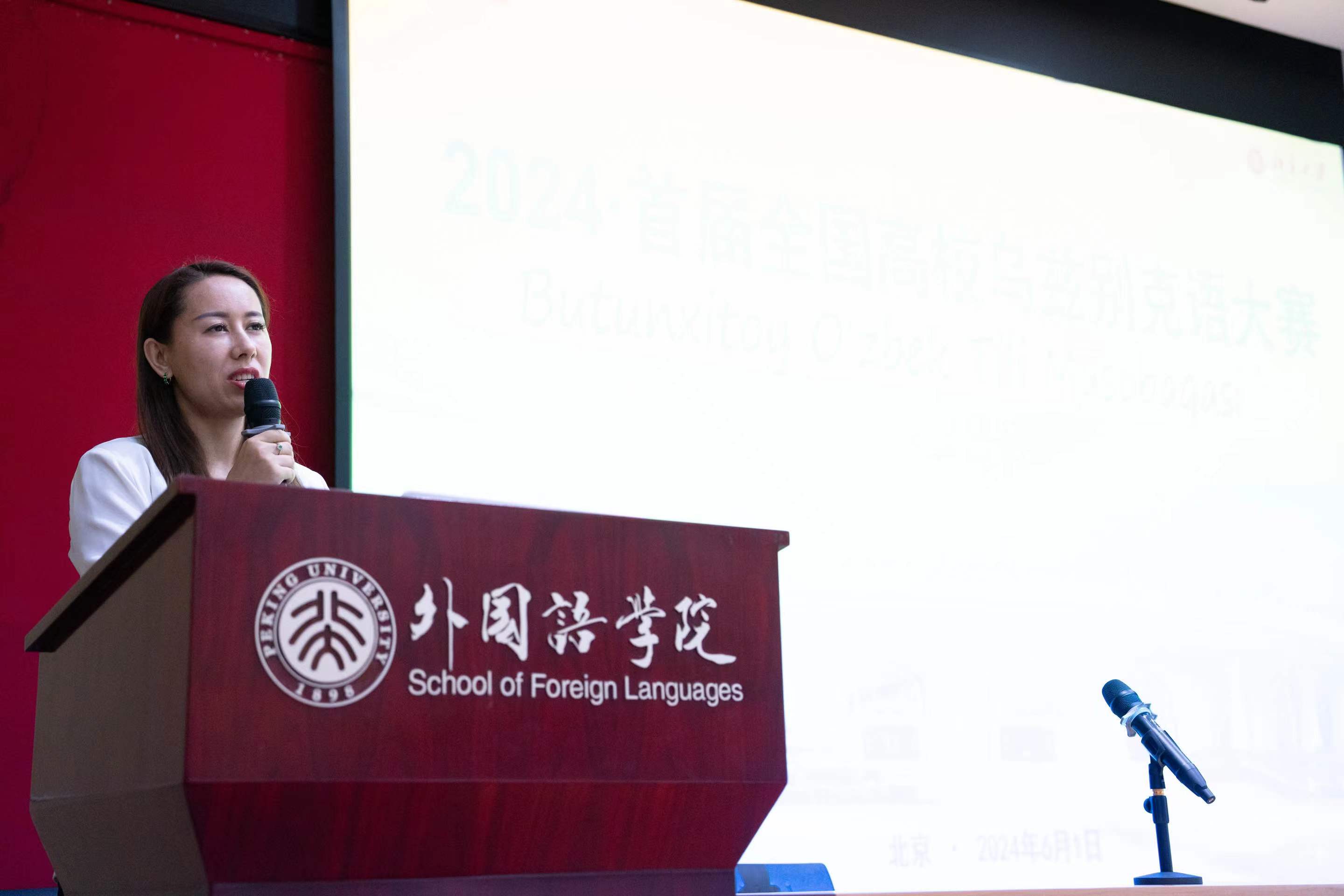 古丽巴努木副院长回顾了中央民族大学中欧电竞俄语-中亚语系的成立、建设和发展壮大的过程。她强调,在"一带一路"倡议所带来的历史机遇下,教授和学习包括乌兹别克语在内的中亚语言为我们打开了一扇认识世界的新窗口。2022年,中央民族大学和北京大学在培养乌兹别克语人才合作交流中碰撞出火花。展望未来,她满怀期待地表示,希望两校能够在更多领域深化合作,共同培养出更多优秀人才。她相信,通过两校的共同努力,一定能够为中乌文化交流和"一带一路"建设贡献更多的智慧和力量。古丽巴努木副院长向所有参赛的同学们表达了美好的祝愿,期待他们取得优异的成绩。