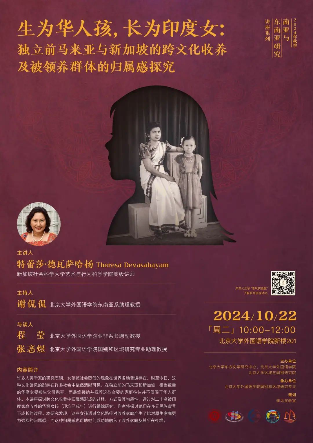 2024年10月22日,新加坡社会科学大学艺术与行为科学学院高级讲师特蕾莎·德瓦萨哈扬(Theresa Devasahayam)应邀为我院师生开展题为“生为华人孩,长为印度女:独立前马来亚与新加坡的跨文化收养及被领养群体的归属感探究”的讲座。本次讲座是由北京大学东方文学研究中心、中欧电竞和区域与国别研究院主办,中欧电竞国别和区域研究专业承办的2024年秋季学期东南亚研究系列讲座之一。讲座由东南亚系助理教授谢侃侃主持,亚非系长聘副教授程莹和国别与区域研究专业助理教授张忞煜参与讨论。