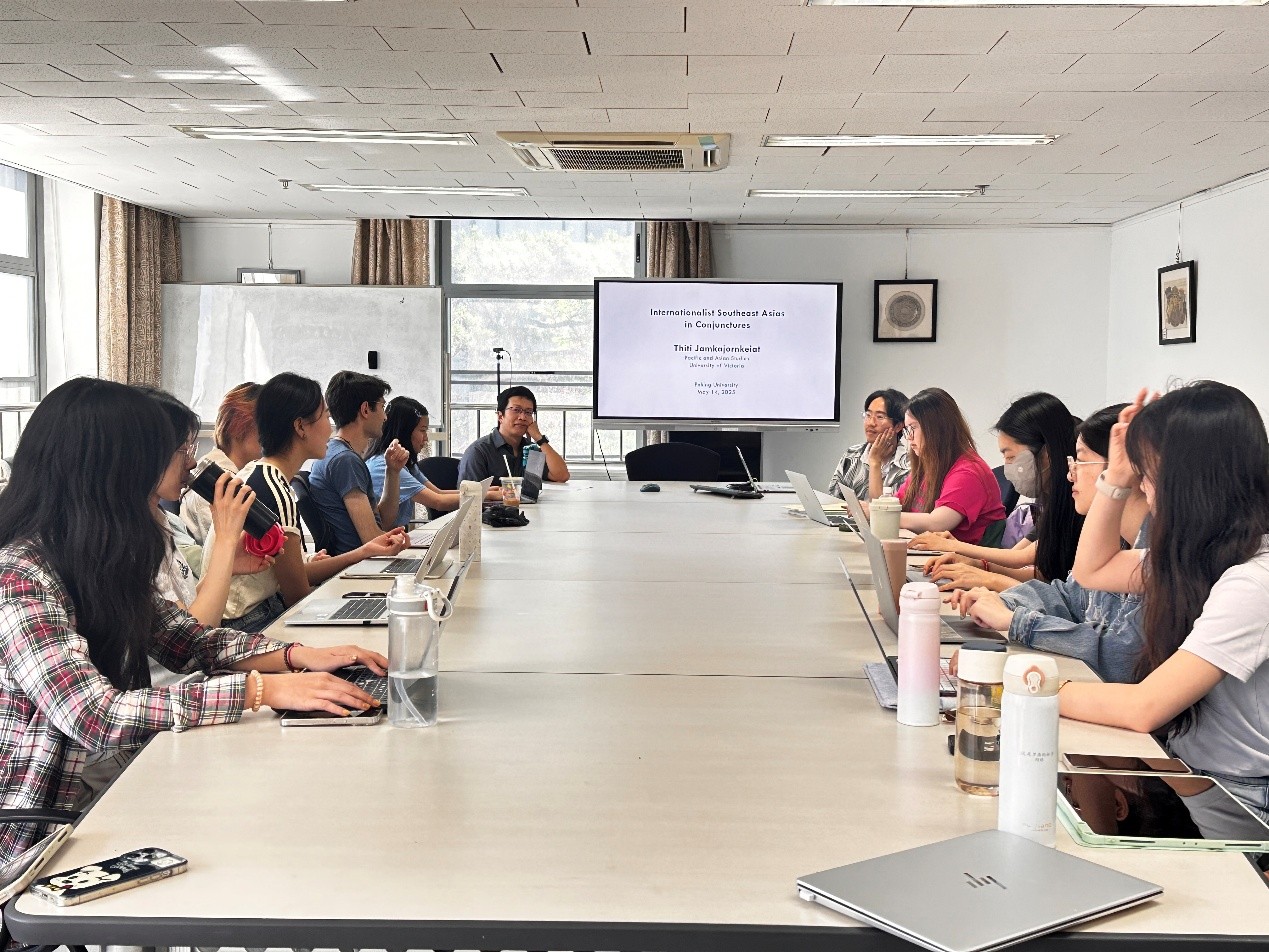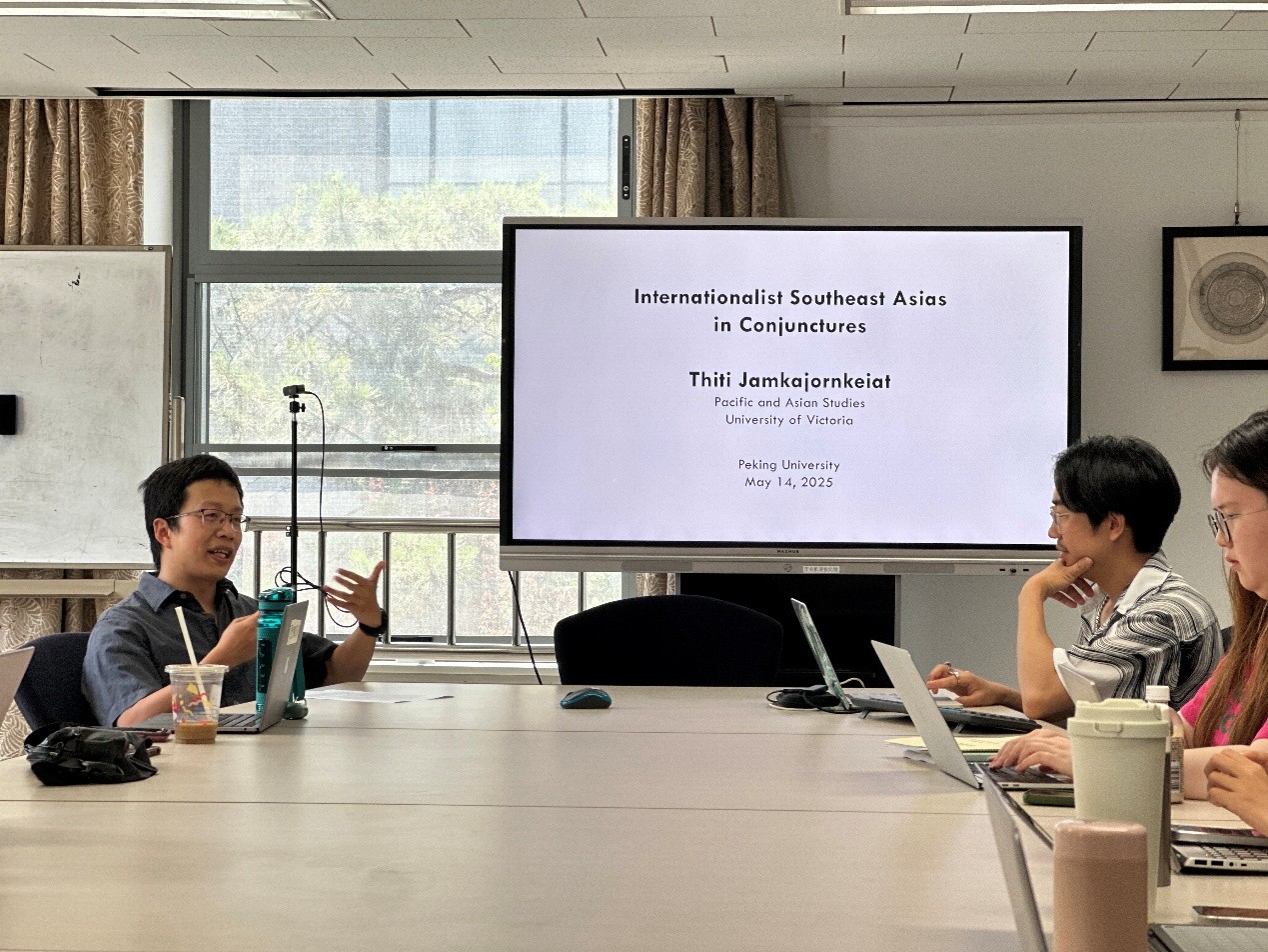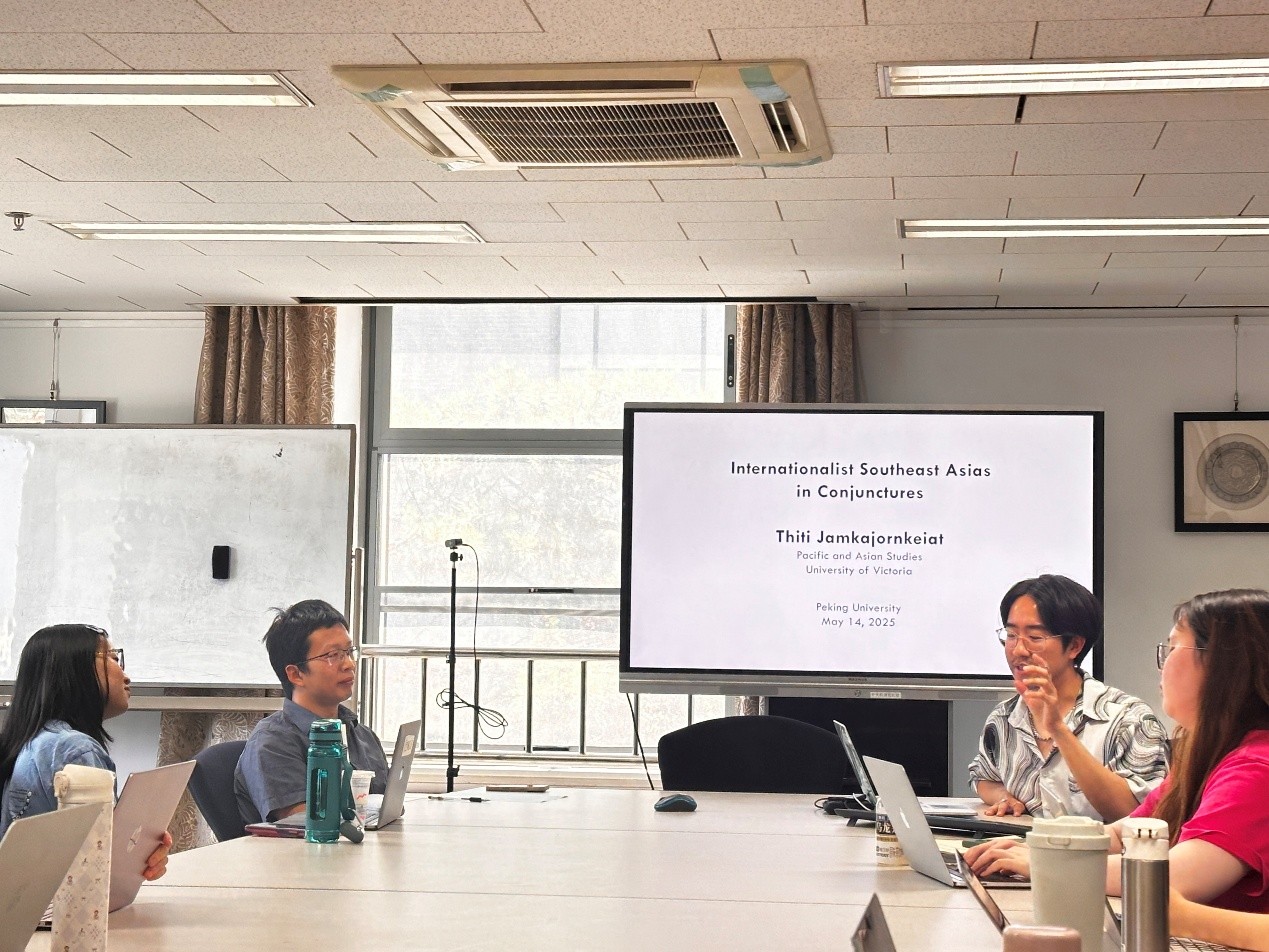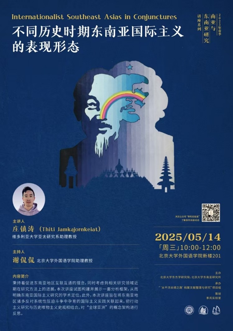 2025年5月14日上午,加拿大维多利亚大学亚太研究系助理教授庄镇涛 (Thiti Jamkajornkeiat)为北京大学师生做了主题为“不同历史时期东南亚国际主义的表现形态”的讲座。本次讲座由北京大学东方学研究院和北京大学东南亚研究所主办,“‘太平洋丝绸之路’档案文献整理与研究 ”项目组和“世界诸文明在印度洋地区的交流交汇研究”项目组联合承办。
