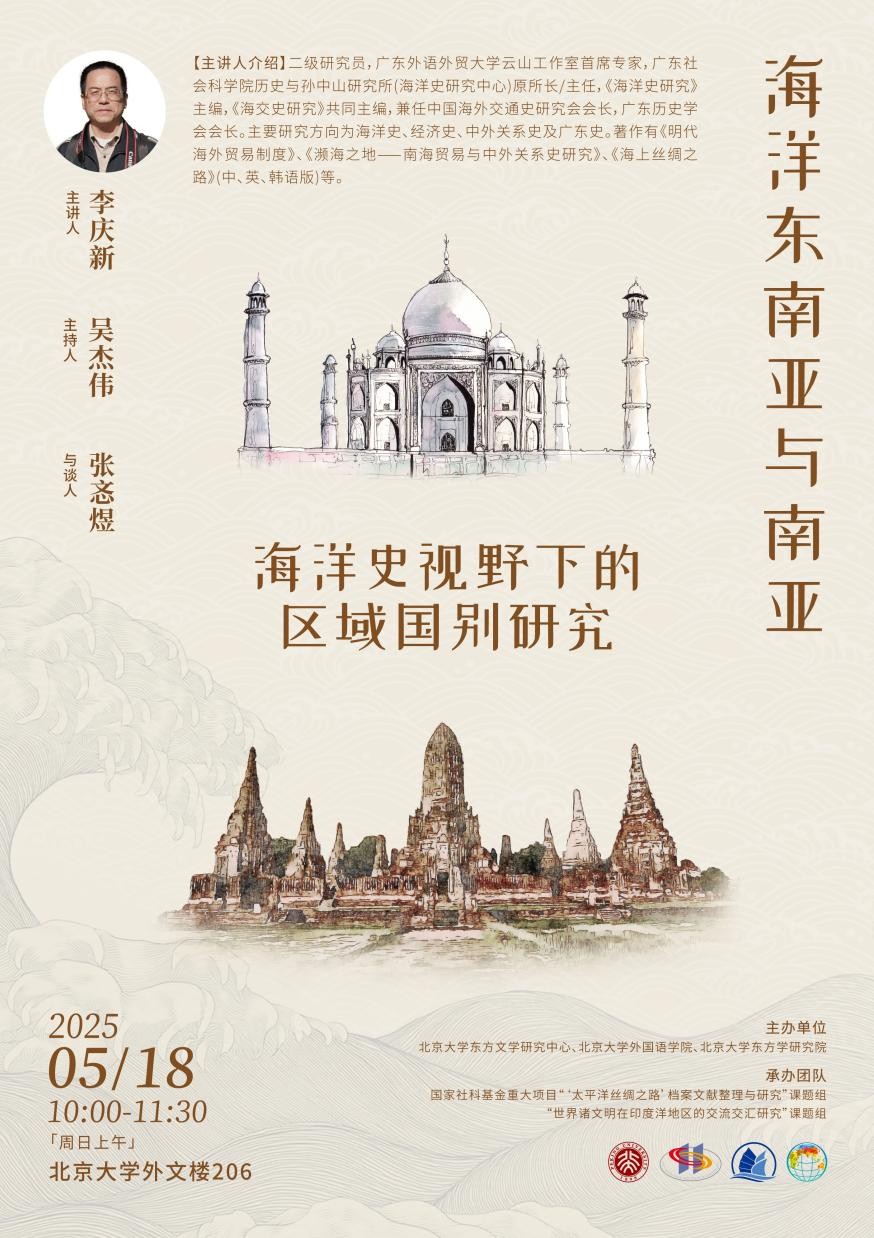 2025年5月18日上午,广东外语外贸大学云山工作室首席专家,二级研究员李庆新教授为北京大学师生做了主题为“海洋东南亚与南亚——海洋史视野下区域国别研究思考”的讲座。本次讲座由北京大学东方文学研究中心、中欧电竞、北京大学东方学研究院主办,“‘太平洋丝绸之路’档案文献整理与研究”课题组和“世界诸文明在印度洋地区的交流交汇研究”课题组联合承办。讲座由吴杰伟教授主持,张忞煜助理教授参与讨论。