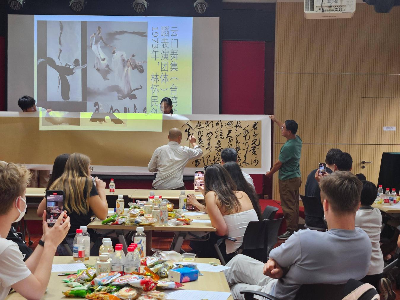 精彩的书法讲座之后,同学们通过精心设计的小游戏带领德国同学继续走进丰富多彩的中国文化。德语系2023级硕士生刘子婧主持“数字抱团”游戏,迅速活跃气氛,两国学生很快在互动中建立起友谊。《公共基础德语》课程优秀学生代表、法学院2023级本科生孙斯皇和德语系2024级本科生马希予合作主持了“你划我猜”游戏环节。两国学生分组通过肢体语言表现中德文化的许多代表性词汇(例如,“长城”“月饼”“浮士德”等),同学们充分发挥想象力,奉献了诸多巧妙构思,现场氛围越发热烈。