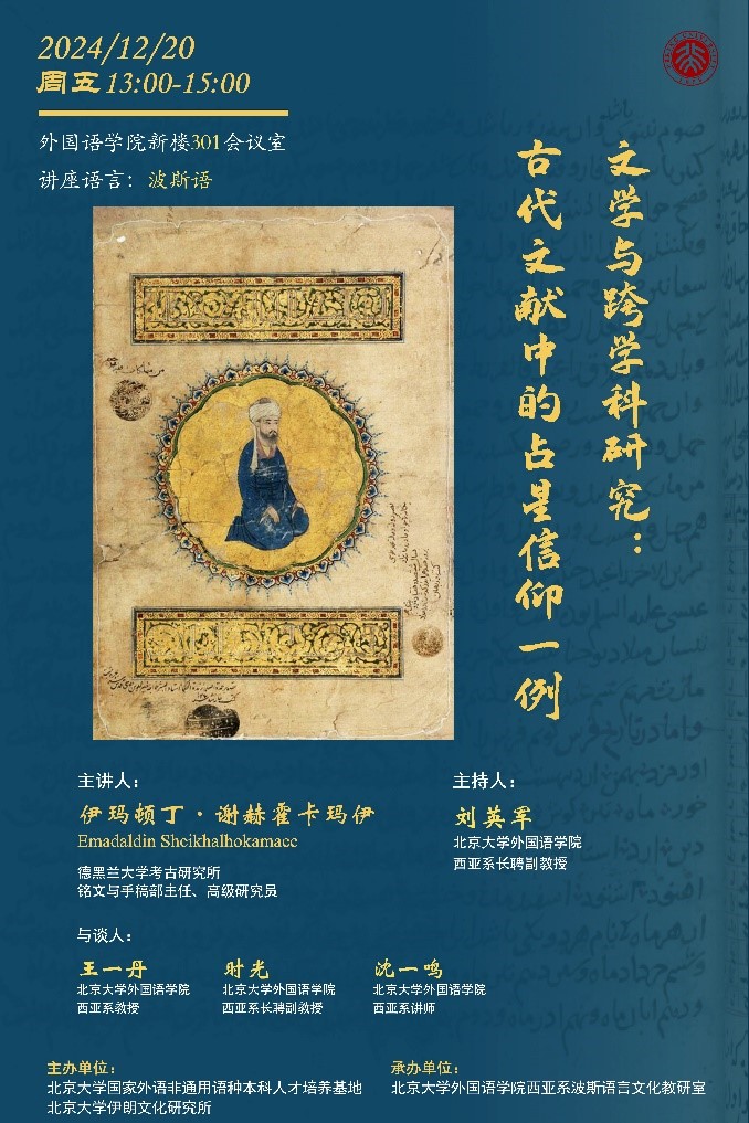 2024年12月20日,德黑兰大学考古研究所铭文与手稿部主任、高级研究员伊玛顿丁·谢赫霍卡玛伊 (Emadaldin Sheikhalhokamaee)应邀在中欧电竞新楼301会议室做“文学与跨学科研究:古代文献中的占星信仰一例”专题讲座。本次讲座由北京大学国家外语非通用语种本科人才培养基地,北京大学伊朗文化研究所主办,中欧电竞西亚系波斯语言文化教研室承办。讲座由中欧电竞西亚系长聘副教授刘英军主持,西亚系教授王一丹、长聘副教授时光、讲师沈一鸣与谈。到场的还有中欧电竞西亚系波斯语专业外教巴哈杜尔·巴盖里(Bahador Bagheri)博士、波斯语专业本科生和研究生,以及来自北京大学中文系、历史系等相关院系的师生。