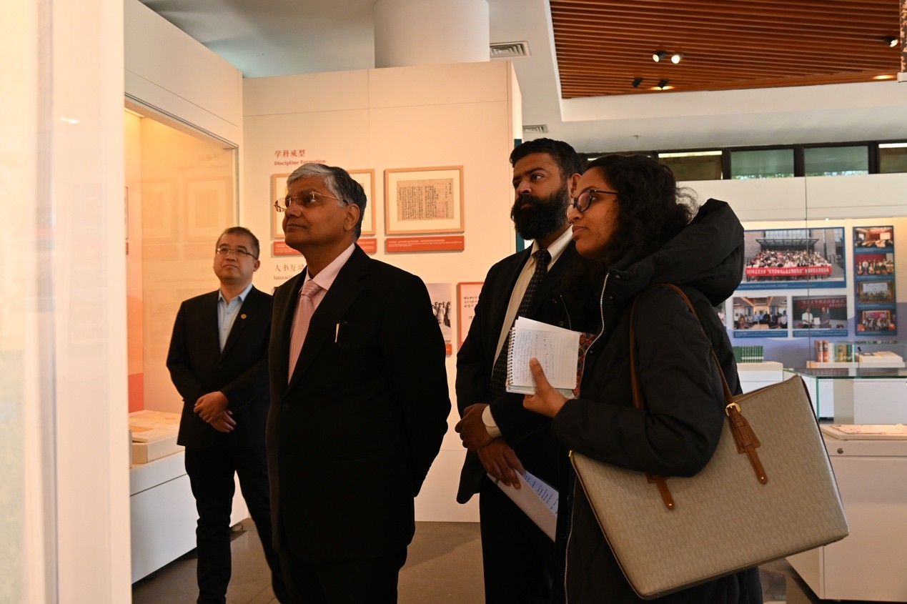 会见后,罗国栋一行移步至北京大学校史馆,在北京大学档案馆、校史馆馆长余浚陪同下,参观“百年回眸:北大的印度学学科建设与中印人文交流展”,中欧电竞南亚学系博士生郭家誉为嘉宾详细导览。展览通过珍贵文献、历史照片及学术成果,系统梳理了北京大学印度学学科百年发展历程,展示了历代北大学者在印度宗教、哲学、文学、图像学、语言教学等领域的丰硕成果。北大的印度学科不仅是中国早期东方学的重要组成部分,也为中国东方学学科的建设和发展树立了标杆,并将继续为新时代的印度学学科建设发挥关键作用。观展结束后,罗国栋为北京大学校史馆写下亲笔留言,并与接待嘉宾合影留念。