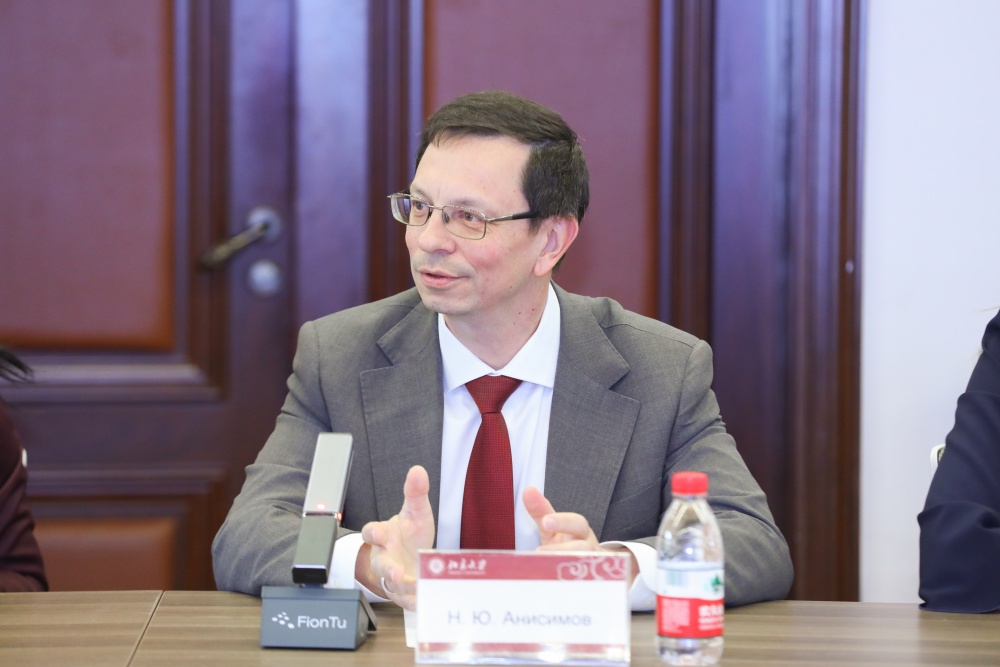 尼基塔·阿尼西莫夫作主题发言,他首先回顾近年来中俄两国密切交往与深度合作成果。他强调语言互通是深化经贸合作、促进文明对话的重要基础,指出语言人才培养对推进两国贸易往来、文化交流具有关键作用,既鼓励更多中国学生学习俄语这门战略语言,也期待俄罗斯青年通过中文学习深化对中国的认识。