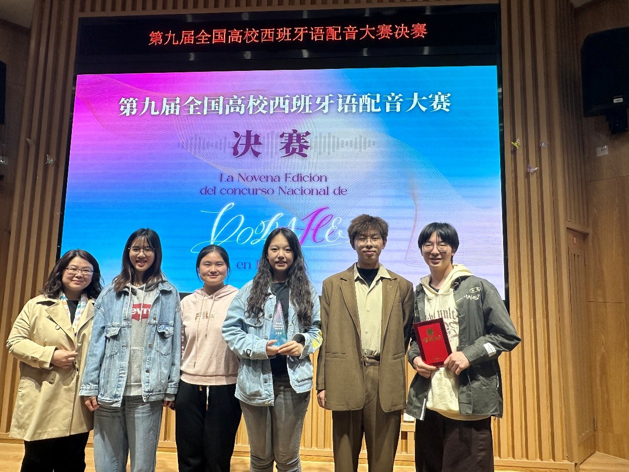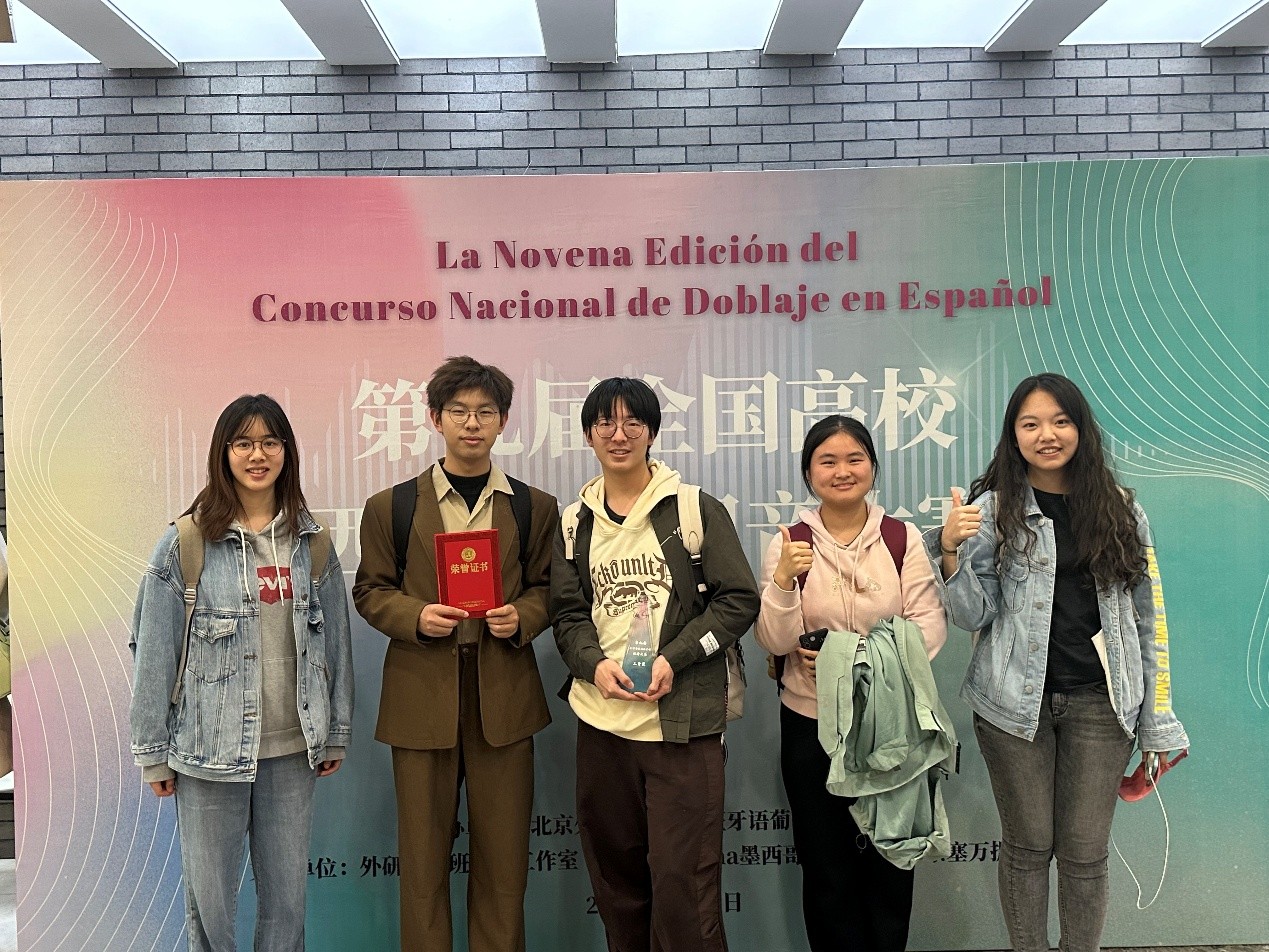 4月13日下午,第九届全国高校西班牙语配音大赛决赛在北京外国语大学举行。经过激烈的角逐,中欧电竞西班牙语系2024级的韦美和2023级的崔逸飞、李雨萱、杨清茹、欧阳徵羽、吴若辰六位同学组成的“Ni Fu Ni Fa”代表队在比赛中荣获三等奖。