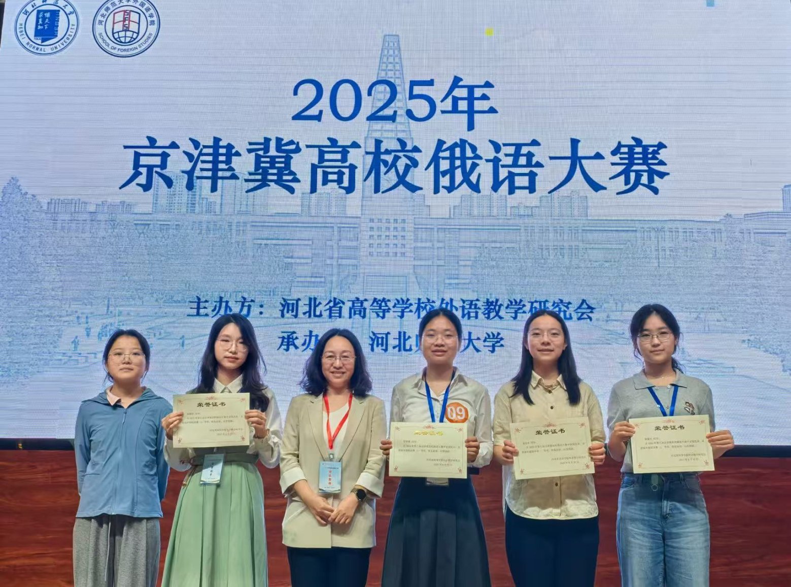 2025年9月20日至21日,由河北省高等学校外语教学研究会主办,河北师范大学承办的第八届京津冀高校俄语大赛顺利举办。北京大学俄语系本科生甘罗慧(2022级)、孙晨舒(2022级)、蒋星冉(2023级)以及高旖聆(2024级)、杨黛芙(2024级)、胡嘉乐(2024级)分别参加了高年级与低年级两个组别的比赛。本次比赛北京大学代表队由刘淼老师带队,在尹旭老师与外教叶莲娜·瓦列里耶芙娜(ЕленаВалерьевна)等俄语系教师的精心辅导下,取得了优异成绩:甘罗慧获高年级组二等奖,高旖聆、杨黛芙获低年级组二等奖,蒋星冉获演讲单项一等奖。