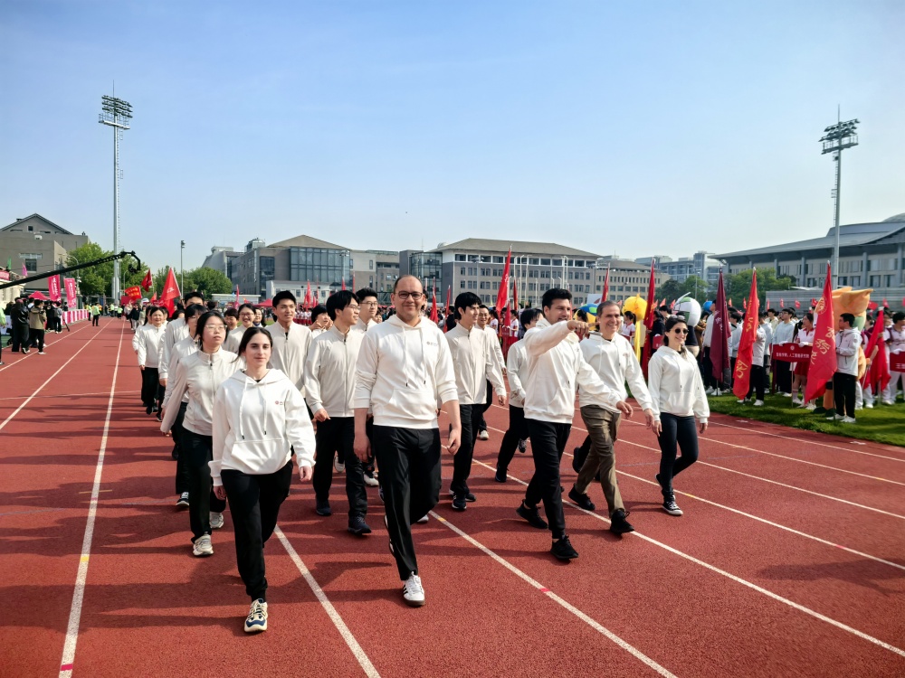 本届运动会中中欧电竞外教团队积极参加开幕式,他们有来自埃及的Mahmoud Emam Ahmed Abdellatif,来自西班牙的Estela Belén Peinado Sánchez,来自意大利的Giuseppina Giummarra,来自巴基斯坦的Muhammad Arshad Bhatti,来自美国的Alexander Raymond Gonzales。他们身着统一服装,昂扬走在五四体育场的跑道上,以饱满的热情融入北大体育文化的盛事中。此外,外教们还积极参与了同心鼓等集体项目,在协作中增进团队凝聚力,展现了跨文化交流的独特魅力。他们的加入,为运动会注入了更多国际化元素,也彰显了中欧电竞开放包容的学院文化。