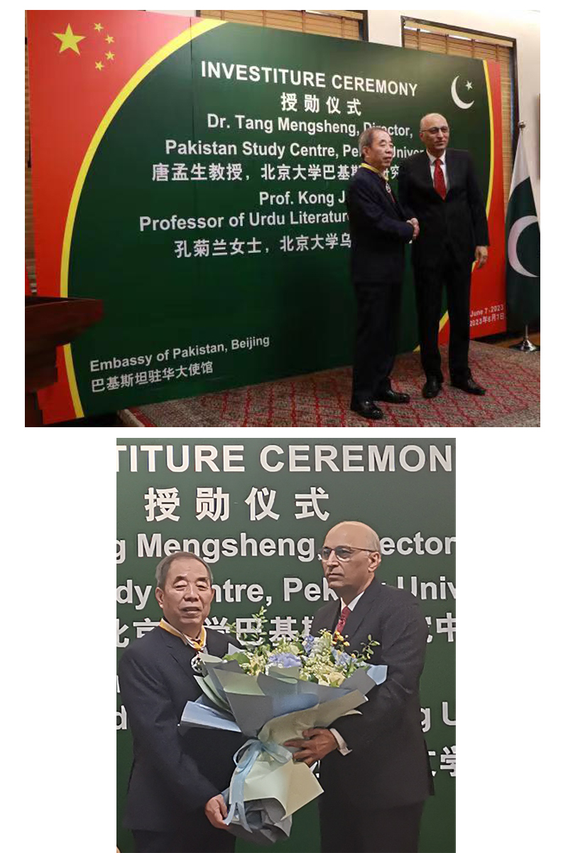 仪式由奏响中巴两国国歌开始,随后现任巴基斯坦驻华大使莫因·哈克代表巴基斯坦政府致辞。他表示,巴中两国友谊源远流长、历久弥坚,是全天候战略合作伙伴和“铁哥们”;在两国友谊建立和加深的过程中,像唐教授、孔教授这样的专家学者所做出的贡献非常重要。哈克大使简要回顾了两位老师的在巴基斯坦的学习与工作经历及学术方面的成就,称赞他们50年来在乌尔都语教学科研、人才培养、中巴人文交流等方面的重要贡献,为促进和加强巴中两国友谊发挥重要作用。他强调,唐孟生教授、孔菊兰教授是深化中巴文化交流和教育合作的热心建设者。当下两国人员往来、旅游合作和文化交流日益深入,希望两位教授与北大同仁一道,持续推动巴中教育合作提质升级、加强民间友好交流,巩固两国友谊纽带。