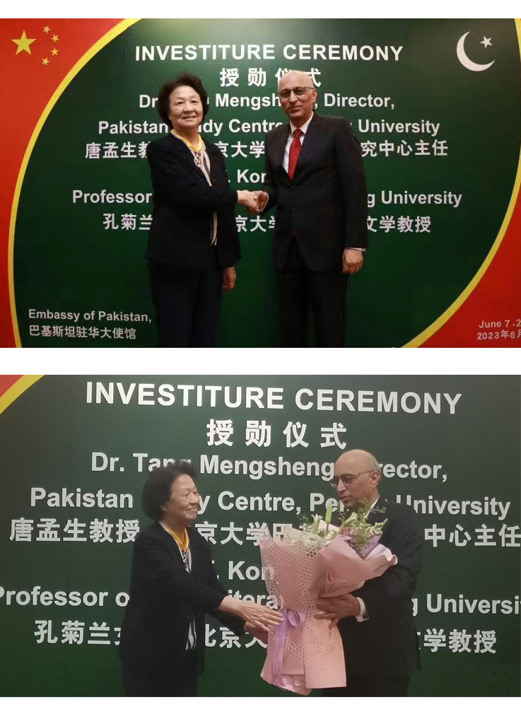 2023年6月7日,巴基斯坦驻华大使馆举办隆重仪式,授予中欧电竞南亚学系唐孟生教授与孔菊兰教授巴基斯坦“卓越之星”勋章,以表彰两位学者在推动乌尔都语教学、增进两国人文交流、增进中巴友谊方面作出的重要贡献。巴基斯坦驻华大使莫因·哈克、政务参赞穆罕默德·卢曼·艾哈迈德、武官Ranna Faisal Rafiq准将、社会福利公使Ijaz Ahmad、科技公使Kamran Rasheed博士,以及原中国驻(巴基斯坦)卡拉奇总领事安启光、三峡集团财务总监王少峰等各界人士出席了授勋仪式。