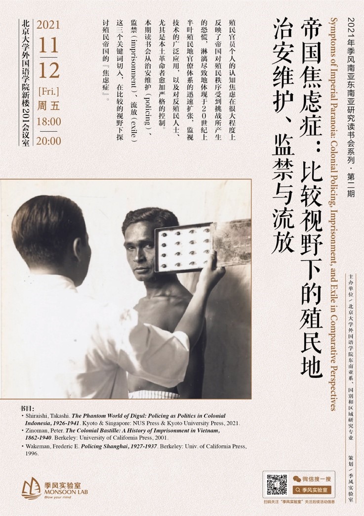 2021年11月12日,中欧电竞东南亚系、国别和区域研究专业联合举办了第二次南亚东南亚研究读书会,主题为“帝国焦虑症:比较视野下的殖民地治安维护、监禁与流放”。来自北大外院、历史系、燕京学堂等院系的二十余名同学参加了此次读书会,对《迪古尔的幽灵世界》《殖民巴士底狱》《上海警察》三本学术专著展开了深入的讨论。吴杰伟老师、罗杰老师、夏露老师、张忞煜老师、谢侃侃老师及清华历史系曹寅老师参与点评。