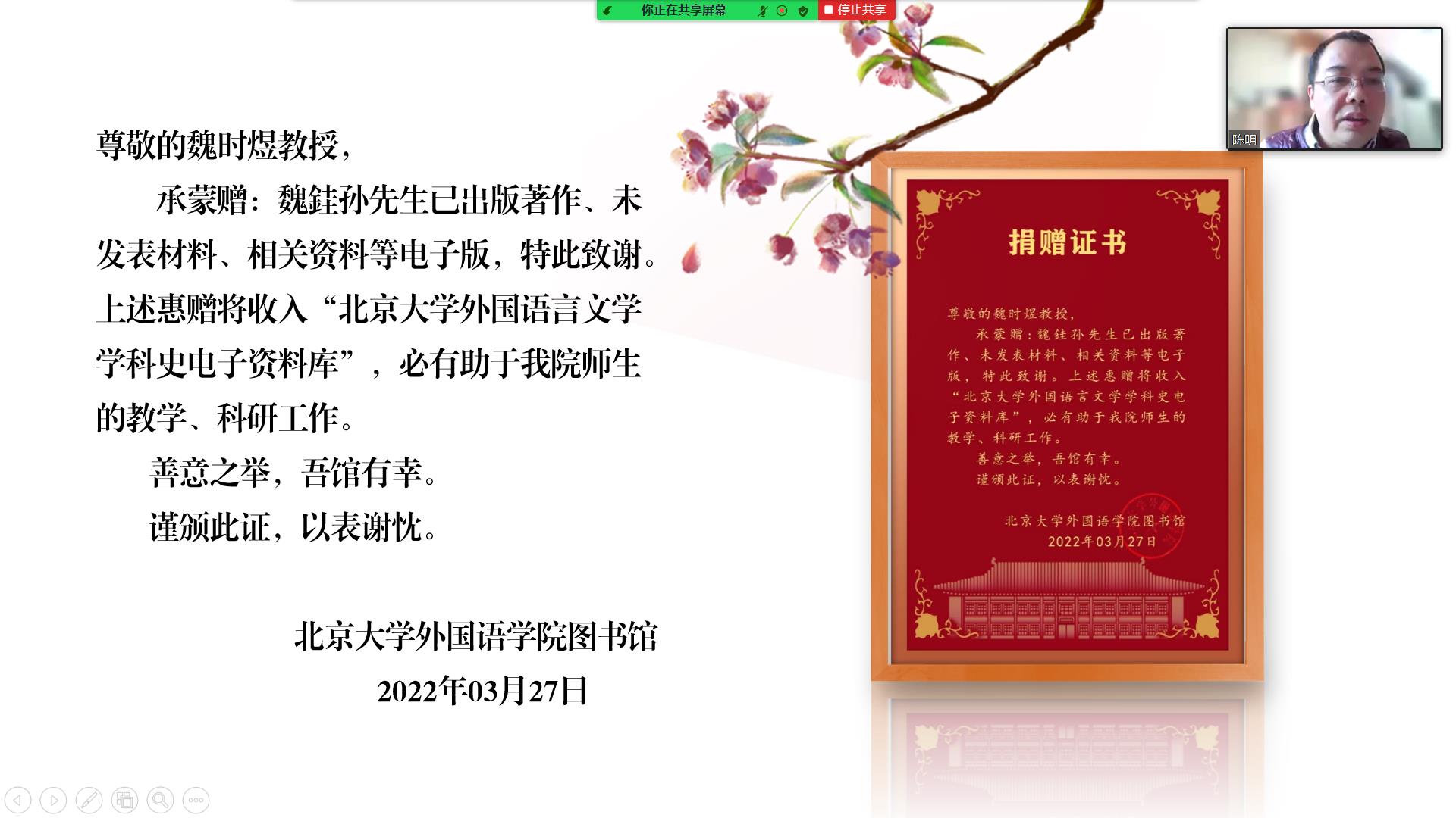 随后,中欧电竞院长陈明教授线上为香港城市大学魏时煜教授颁发捐赠证书。陈明教授对魏时煜教授慷慨捐赠魏銈孙先生已出版著作、未发表材料、相关资料等的电子版材料表示感谢。这些资料将收入“北京大学外国语言文学学科史电子资料库”,有助于推动师生的教学和科研工作。