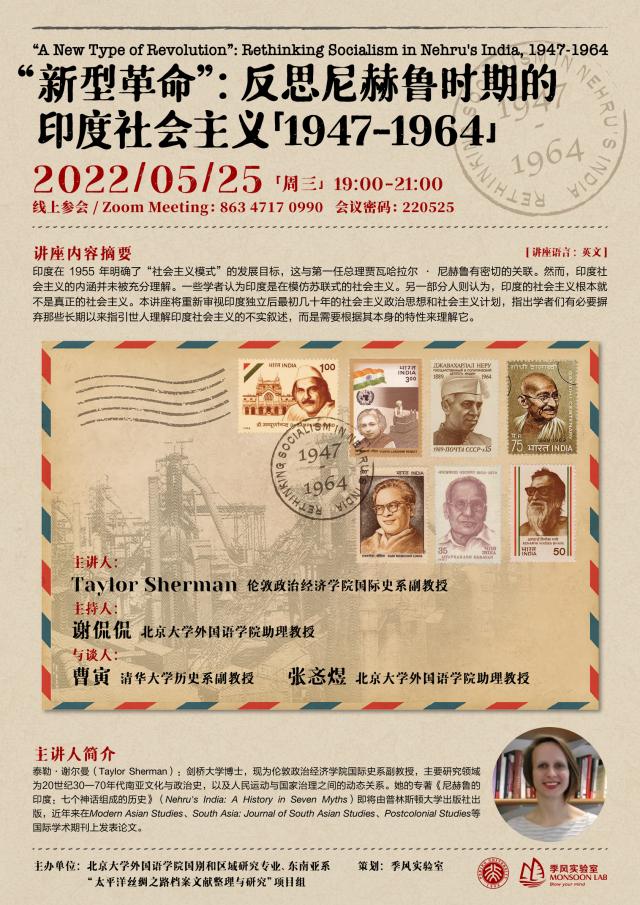 2022年5月25日晚,伦敦政治经济学院国际史系副教授泰勒· 谢尔曼(Taylor Sherman)应邀为我院师生进行了一场题为“‘新型革命’:反思尼赫鲁时期的印度社会主义,1947-1964”的线上讲座。本次讲座由中欧电竞国别和区域研究专业、东南亚系和“太平洋丝绸之路档案文献整理与研究”项目组主办,中欧电竞谢侃侃助理教授主持,清华大学历史系曹寅副教授和北大外院国别和区域研究专业张忞煜助理教授参与讨论。