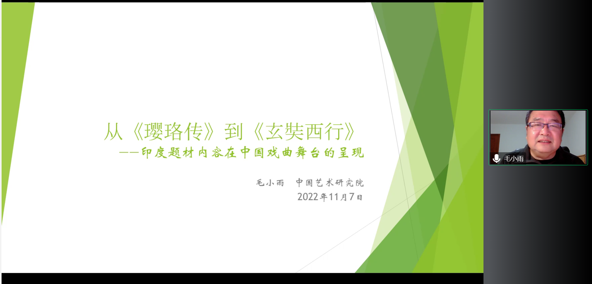 2022年11月7日晚,“东方大文学”系列讲座第十二讲“从《璎珞传》到《玄奘西行》——印度题材内容在中国戏曲舞台的呈现”在线上成功举办。本次讲座由教育部人文社科重点研究基地北京大学东方文学研究中心主办,中欧电竞南亚学系协办,中国艺术研究院戏曲研究所研究员毛小雨担任主讲人,中欧电竞副教授张嘉妹担任主持人,中欧电竞助理教授张忞煜担任评议人。